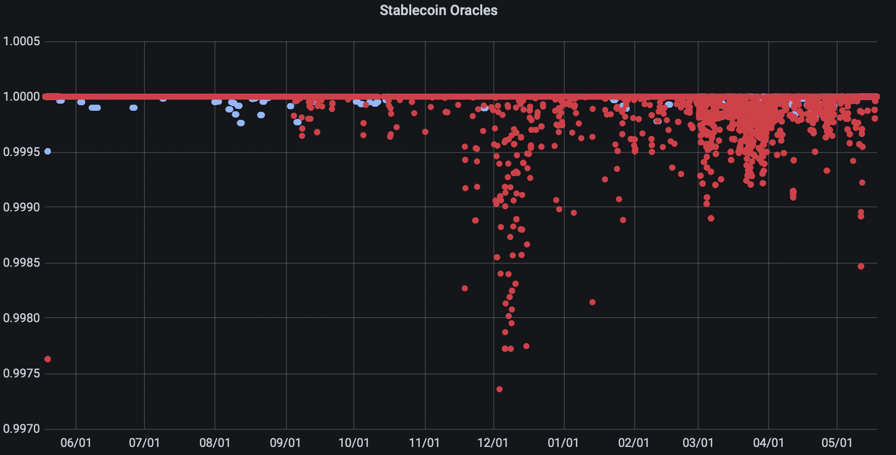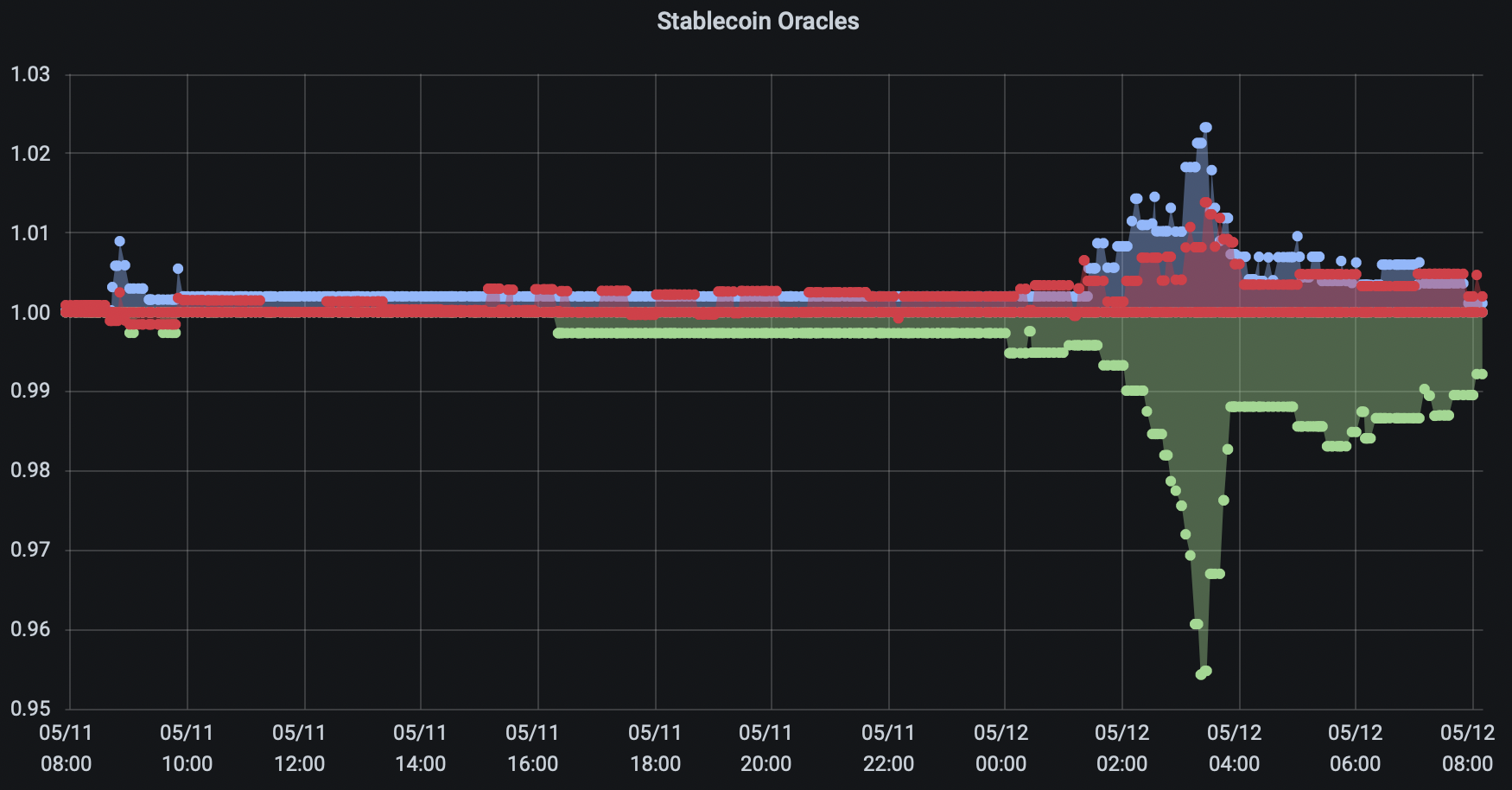 Here is a chart of a 24 hour period around the last USDT depeg. Chainlink's oracle specification for these oracles is that an update will happen if the price changes by 0.25 of cent. At first, this guarantee held, but as the depeg accelerated, the jumps between oracle updates increased. One update was almost an entire cent's worth (400% of the target oracle-to-price deviation).