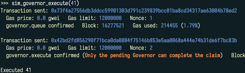 for i in (find . | grep .sol | grep openzeppelin); compare_ozcontracts $i; endTransactions Check🛑 The deployer transaction to transfer governance, transfers ownership of the strategy proxy to deployer address rather than to the governor contract. https://etherscan.io/tx/0xf99cc2433a0d2984e67c44dfc1c3d8d6749f8b2bd17ec9b8f9d200ba143b8999 This also causes the governance proposal to fail, given that the governor cannot accept ownership. I'm guessing this is because both the deployer address and the governor address config were changed for the deploy, when only the deployer address needed to be changed. We can fix by having this deployer address send the correct change governance transaction. Governance Proposal Checkfrom world import *