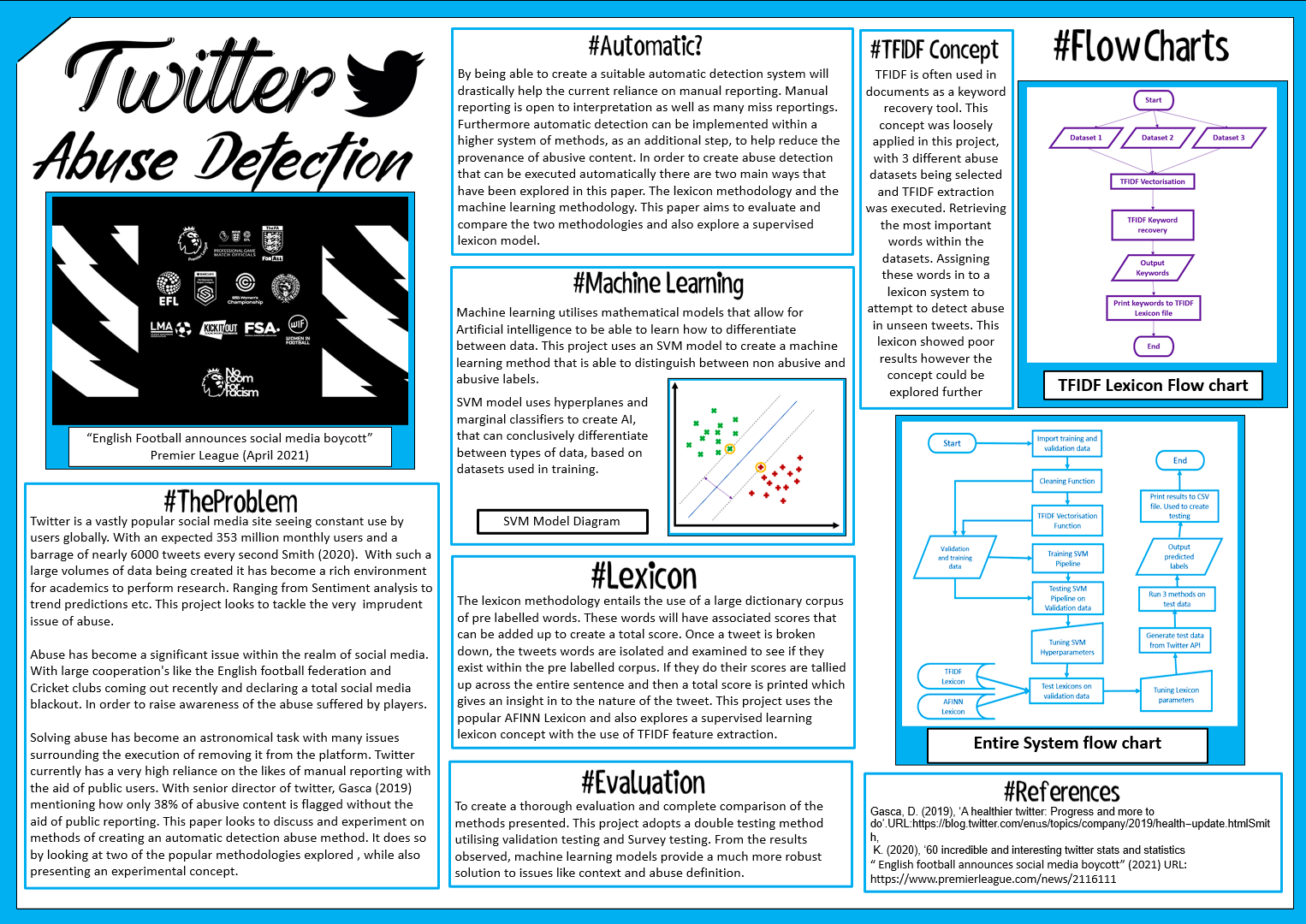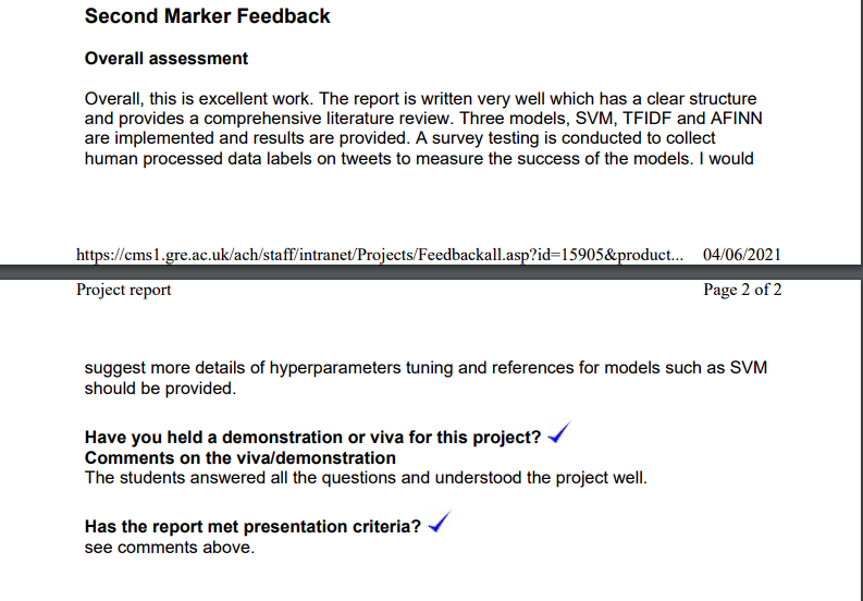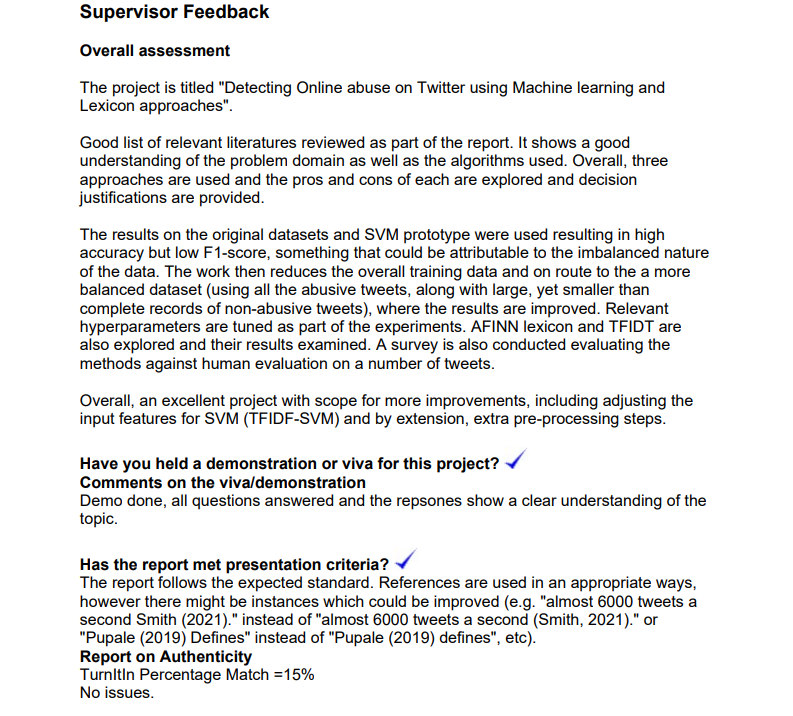 For my Final Year Project i decided to attempt a soloution for abuse on twitter. I decided to opt for a machine learning method that would use existing datasets to try and create an automated approach. I grasped the use of python techniques like Natural Language Processing, Machine learning pipelines, and sentiment analysis. As i progressed through my research i also attempted to evaluate a completely new proposed method that would utilise text classification and combine with a lexicon. This lead to my project evaluating 3 separate methods. I was able to achieve a first class honours through my effort achieving a 78. Below you can find my supervisors assessment of the overall project.