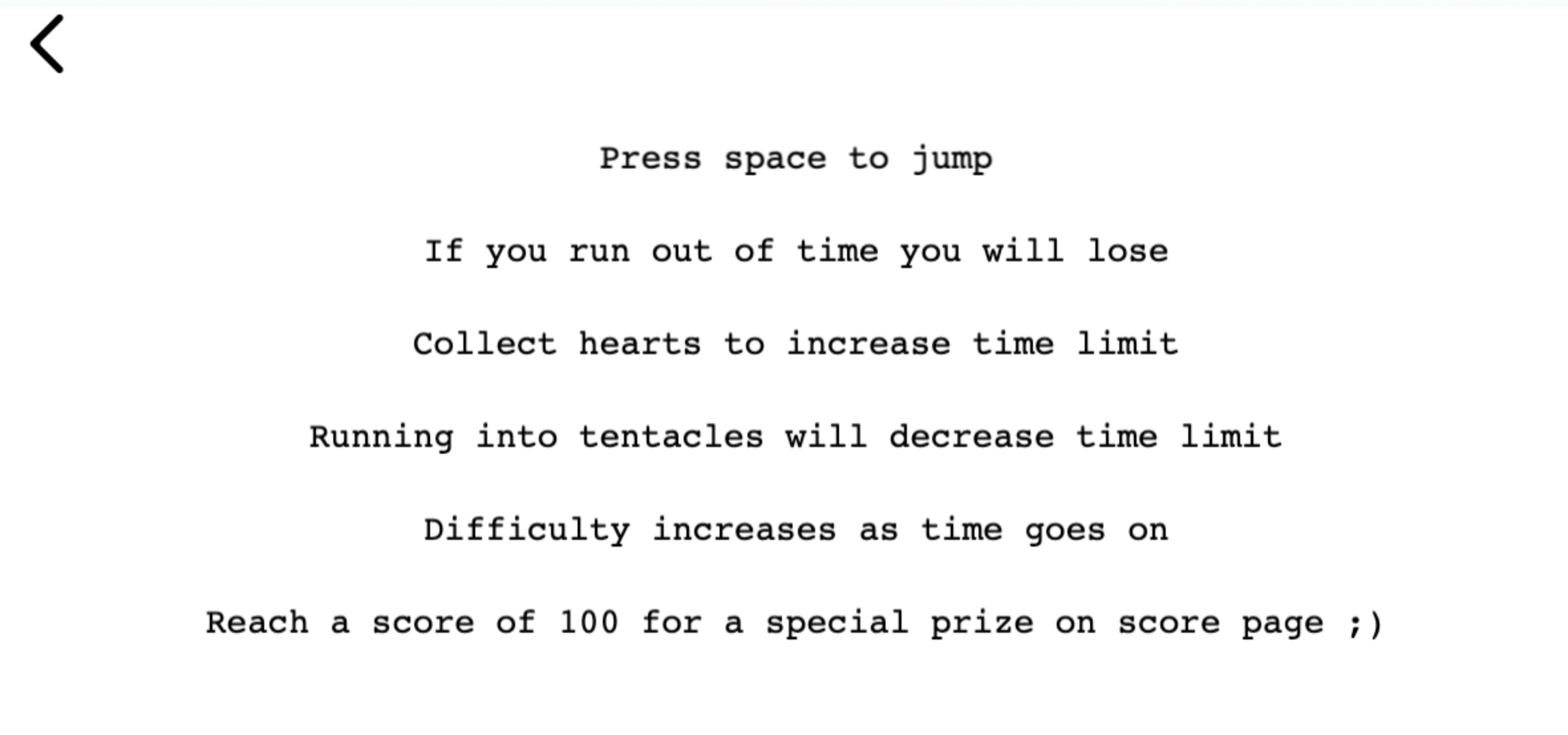 Press space to jump If you run out of time you will lose Collect hearts to increase time limit Running into tentacles will decrease time limit Difficulty increases as time goes on Reach a score of 100 for a special prize on score page A game by Parker Bacall, Music and Sound by Chris Denniston © 2023 All Rights Reserved