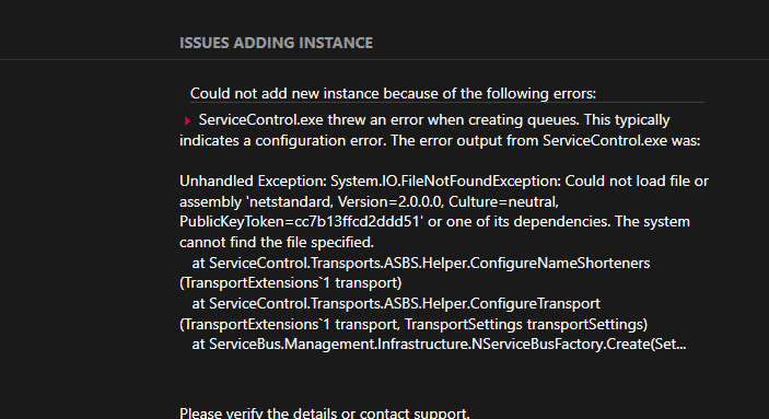 Using the new .NET Standard ASB transport in SC 3.3.0, the following error occurs when creating an instance of ServiceControl:   Windows Server 2016, .Net 4.7.2 installed.