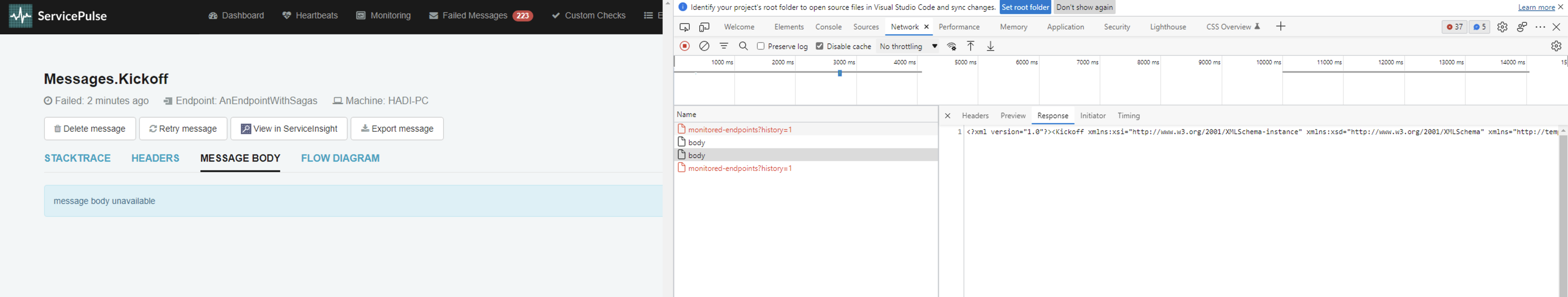 - Check the network tab (in DevTools) and see that the query is made to ServiceControl and the response is coming back in form of a XML document