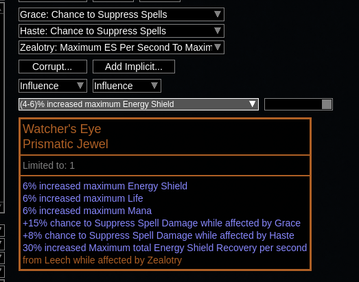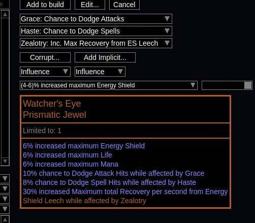 This is actually generated automatically now. https://github.com/PathOfBuildingCommunity/PathOfBuilding/blob/dev/src/Data/Uniques/Special/Generated.lua#L565 I'm not actually sure how you got the dodge mods to appear since the generated version of the jewel should take precedence...were you on a really old version by chance? Regardless, the proper fix would be to simply remove Watcher's Eye from jewel.lua. |