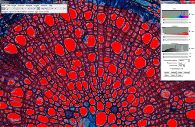 We took pictures of hundreds of double-stained cross-sections. The samples came from wildly different vegetation zones and taxonomic groups. We analyzed the color ratios in the samples and examined the result based on several factors.