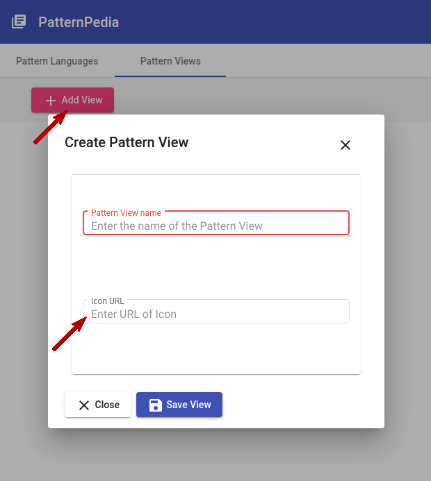 **Describe the bug** Icon URL from creation dialog for a Pattern View is not stored or used **Expected behavior** Remove input element or implement storage and usage, [actually the code handles only the name](https://github.com/PatternPedia/pattern-pedia-views-ui/blob/c5a926d4d2d23acfc347e9d14ae2c2362283245a/src/app/core/component/create-edit-pattern-language/create-edit-pattern-language.component.ts#L83). **Screenshots**