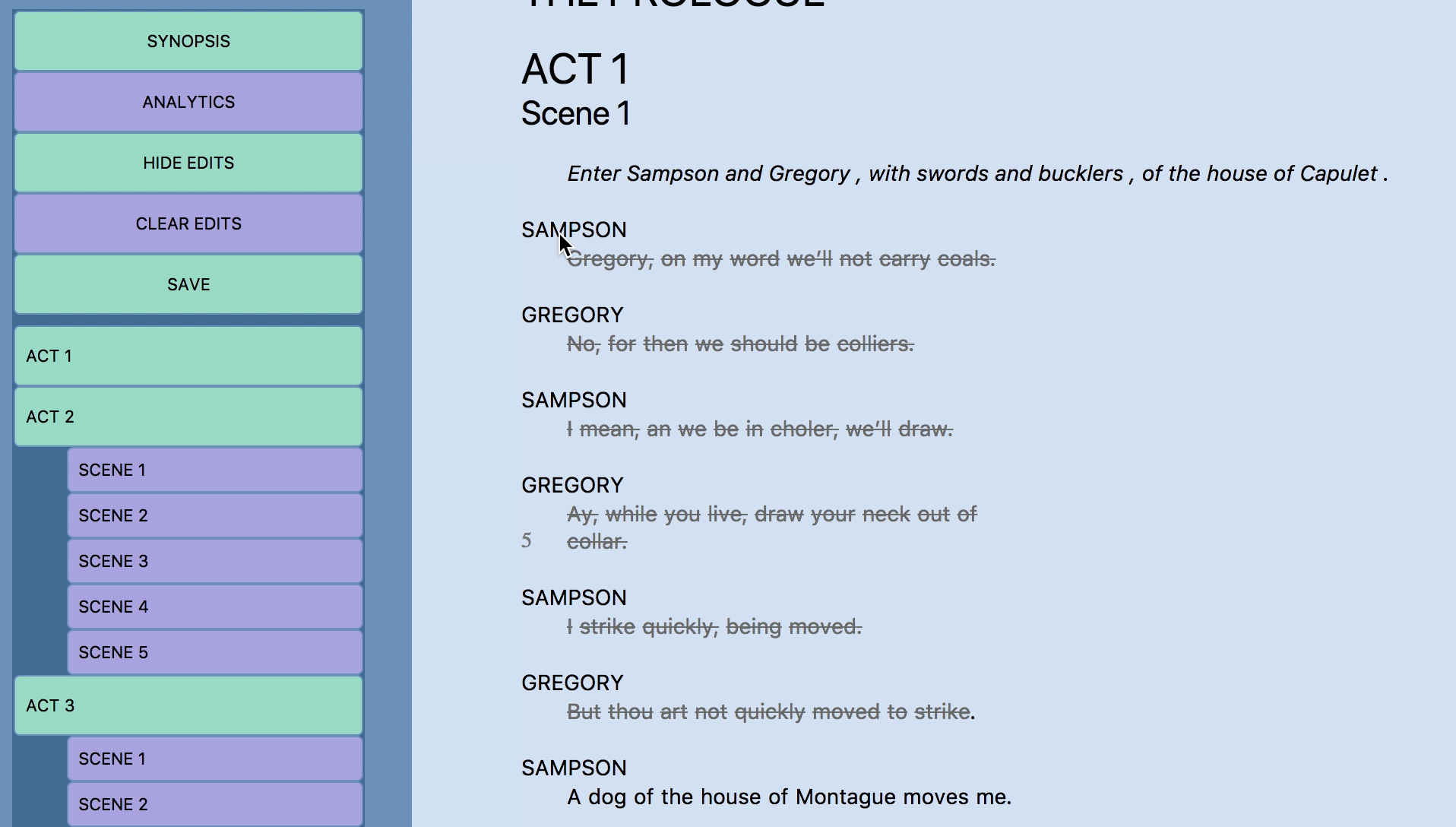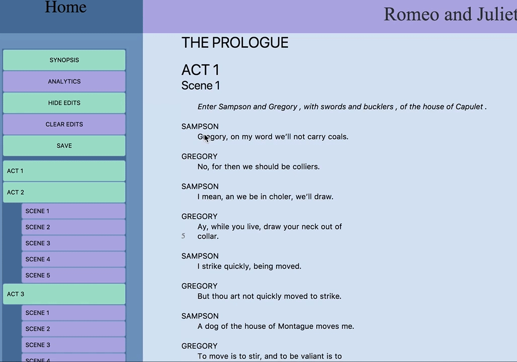 Often when planning a play or preparing for a performance, directors and actors alike tend to cut out sections from the original script to make it shorter or get rid of unnecessary lines. Currently two methods exist for this task, and both have limitations. Directors and actors can either cross out sections by hand and ignore them, which is tedious and makes the plays harder to read and interact with, or they can use a generic text editor like Google Docs, but this provides so much freedom that the original content of the script can be easily manipulated or lost (as in the case where someone adds lines that didn’t previously exist to the script). A dedicated script viewer and editor that primarily only allows cutting and restoring lines would address both of these issues. It would allow for easier cutting and viewing without allowing the play to be lost in edits, while also being able to provide data analysis, like the number of lines per play and which characters are in it, on the works themselves.