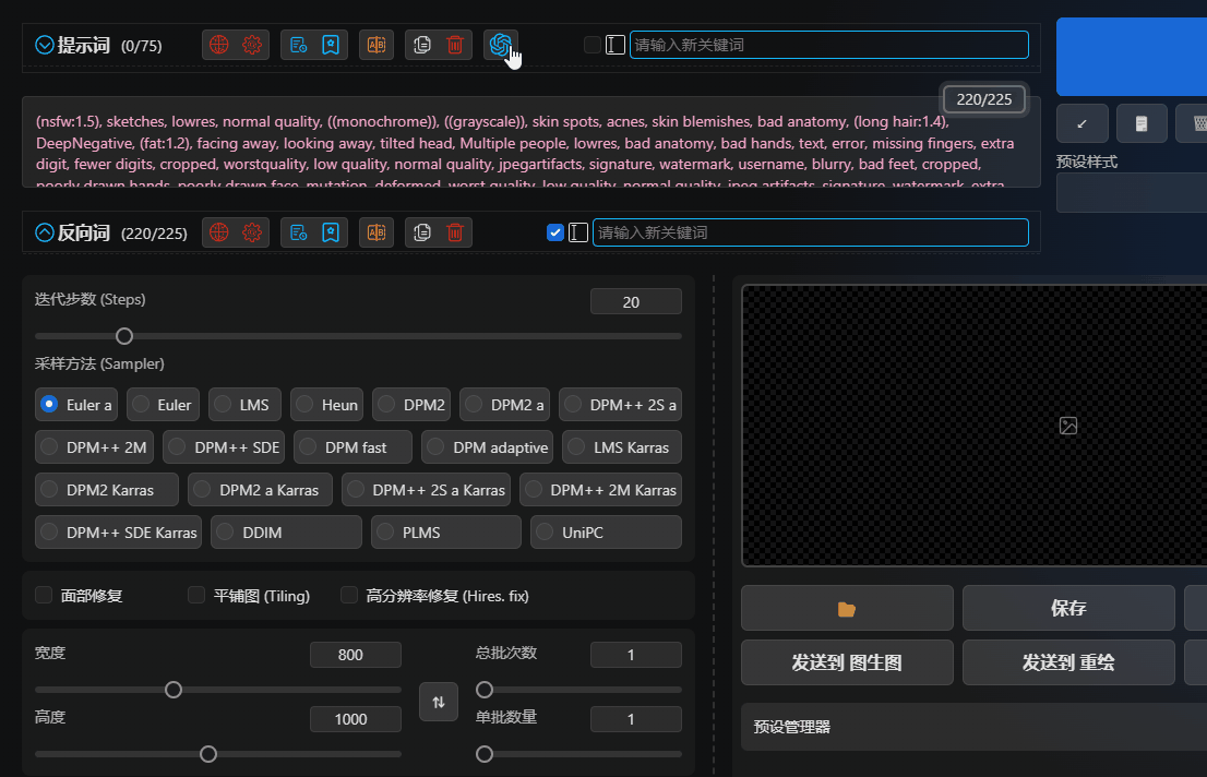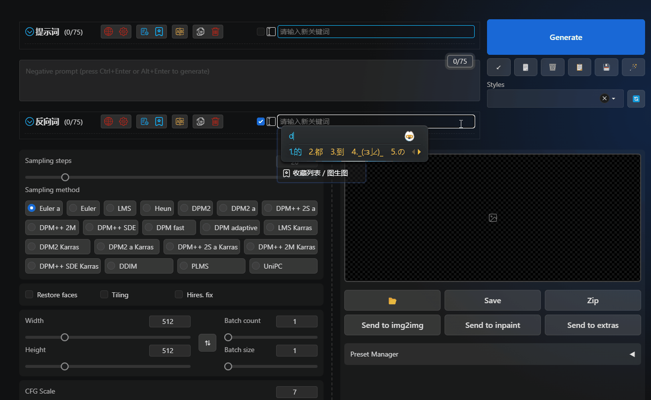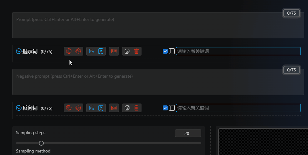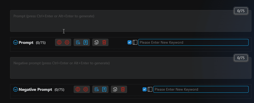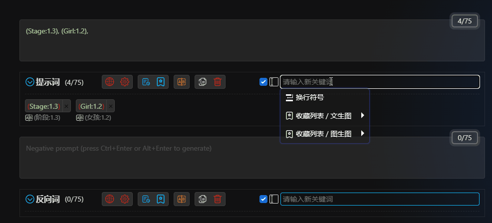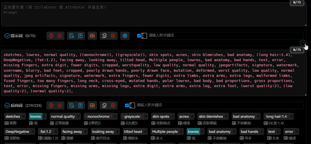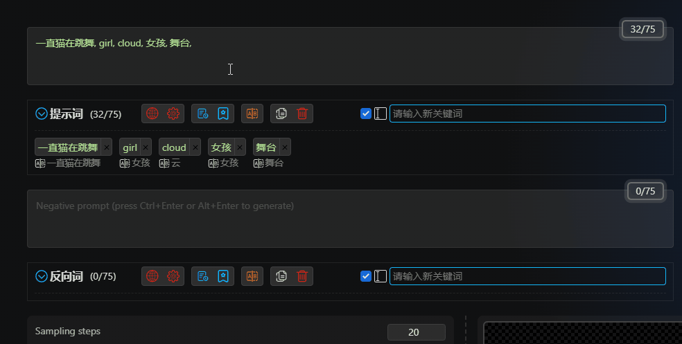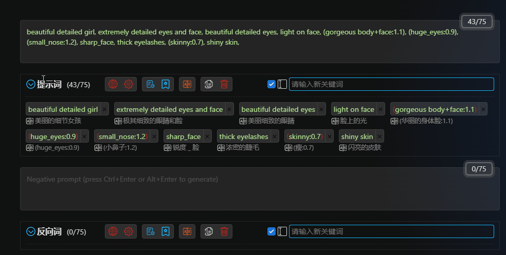 Intuitive input interfaceprovides a more intuitive and powerful input interface, displaying bilingual prompt word comparisons for easy understanding.Automatic translationautomatically translates prompt words/reverse prompt words, supporting multiple languages.Dozens of translation serviceswith dozens of online translations and offline translation models.Multilingual supportsupports translation for most languages spoken in the world, allowing you to input prompt words in any language.History recordsautomatically records when prompt words/reverse prompt words change.Favoritesallows you to quickly bookmark and batch bookmark your favorite prompt words/reverse prompt words.Quick adjustmentsdrag and adjust the position of prompt words, one-click increase or decrease the weight of prompt words, one-click delete, disable, translate, or bookmark, and more.Batch operationsselect multiple prompt words/reverse prompt words in a box, one-click delete, translate, or bookmark, and more.ChatGPTgenerates prompt words intelligently through ChatGPT.Prompt word blacklistallows you to set a blacklist to automatically filter prompt words.One-click adding of prompt wordsthousands of prompt words available, just a click away.Keyword highlightingLora, LyCORIS, Textual Inversion highlighting and detection.Customizable keyword colorsdifferent types of keywords can be displayed in different custom colors.Custom themescustomize themes and extend styles....More features waiting for you to discover.