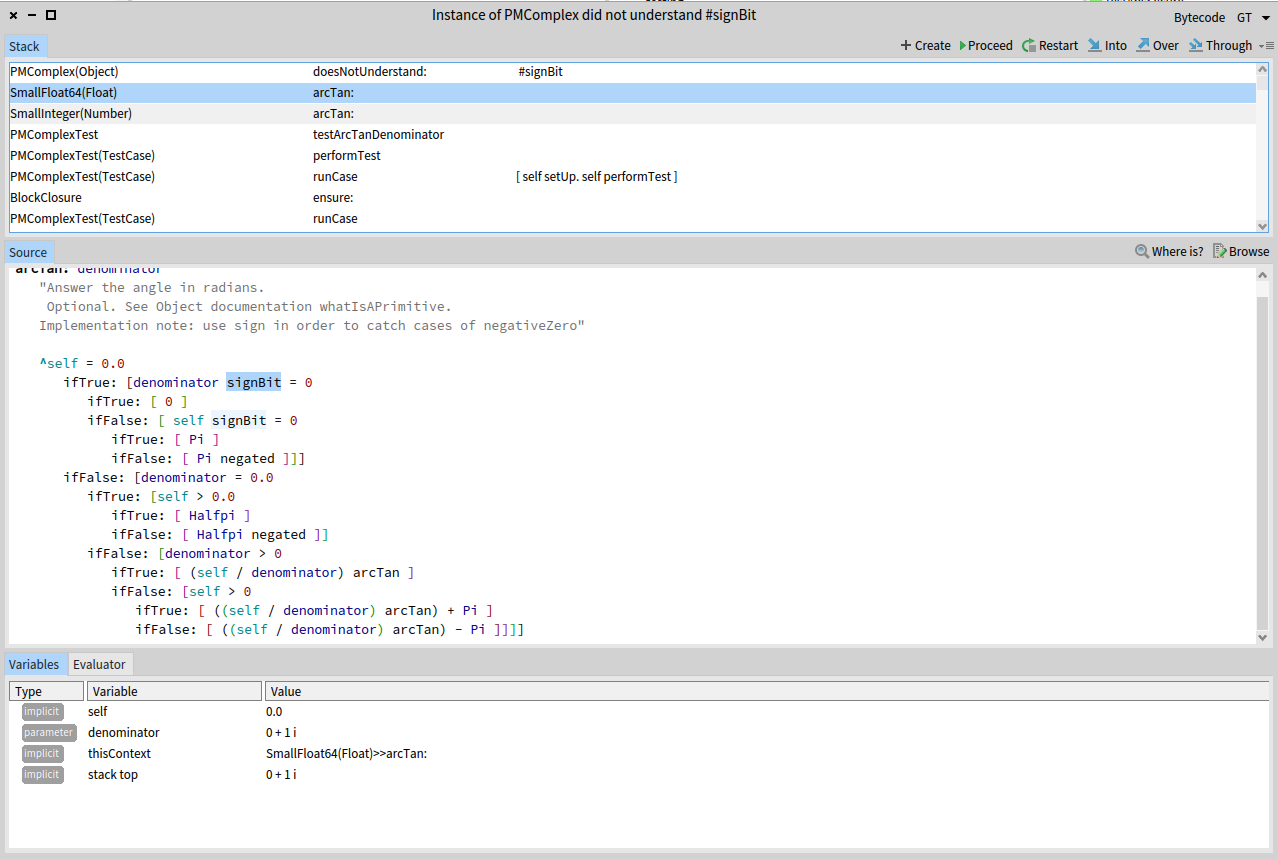 I don't know exactly ... In Pharo 7.0, arcTan: has been redesigned to use signBit instead of sign (in order to detect IEEE-754 negative-zero). PMComplex miss this method and test like |