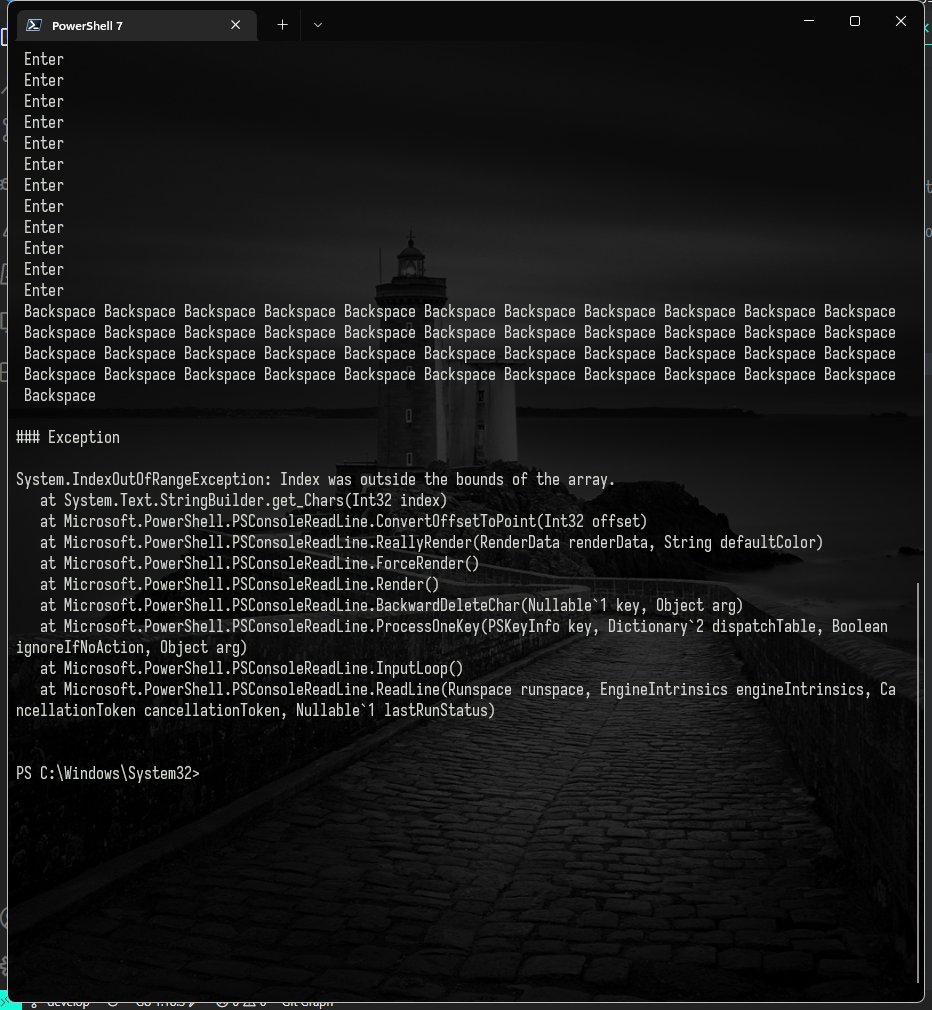 at Microsoft.PowerShell.PSConsoleReadLine.BackwardDeleteChar(Nullable`1 key, Object arg)