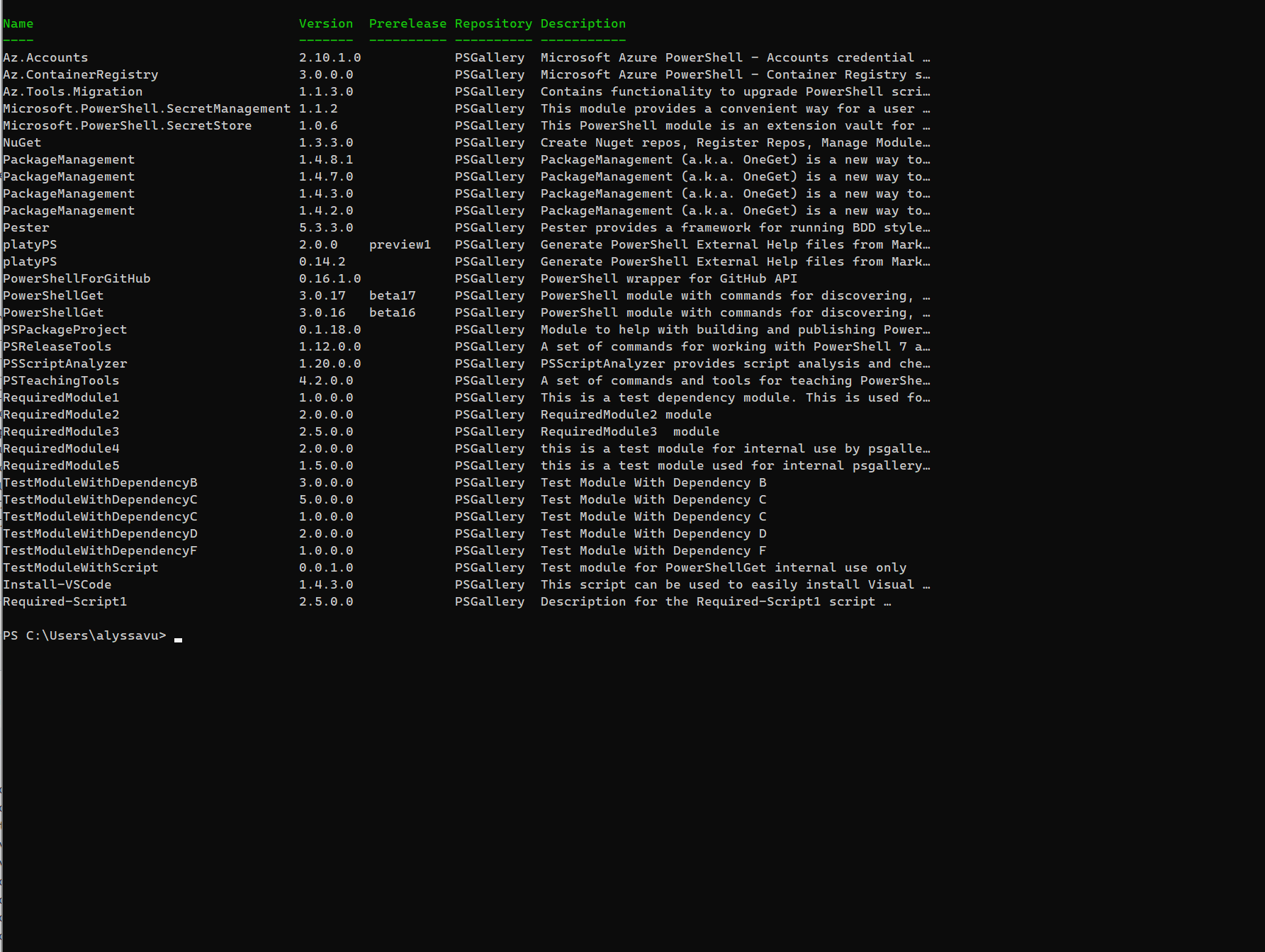 VERBOSE: Successfully installed package 'NuGet' to location 'C:\Users\alyssavu\Documents\PowerShell\Modules'