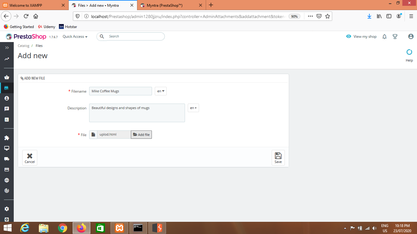 An issue is discovered in PrestaShop version 1.7.6.7 under the Catelog feature when using the file-upload functionality for uploading the Files for various products. This issue exists because it fails to implement file content checks and improperly handles the output, resulting in cross-site scripting attack that leads to cookie stealing or malicious actions.