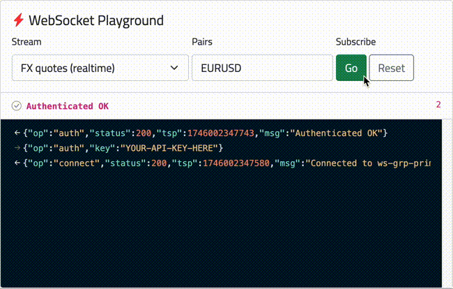 Realtime streaming bid/ask prices for ~2,300 FX trading pairs via a secure WebSocket connection.