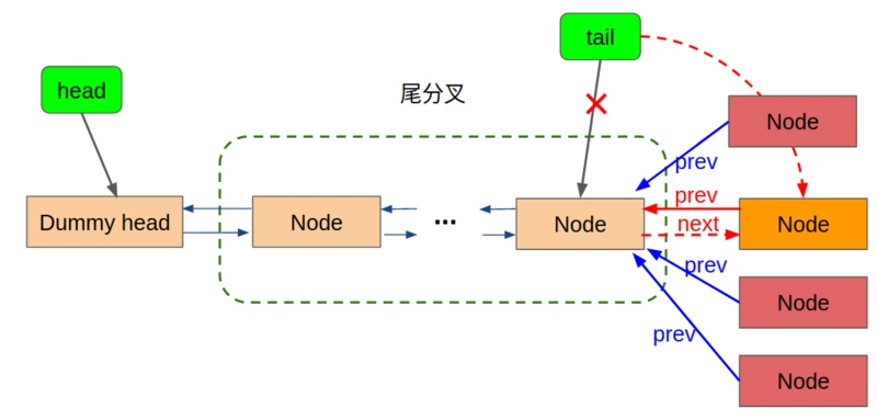在将节点储存到队列中时,会有一个很有趣的现象,叫做尾分叉,理解尾分叉是看懂遍历等待队列的关键 队列不空时,将节点加入队列有三步: 1.设置node的前驱节点为当前的尾节点:node.prev = t. 2.修改tail属性,使它指向当前节点. 3.修改原来的尾节点,使它的next指向当前节点.