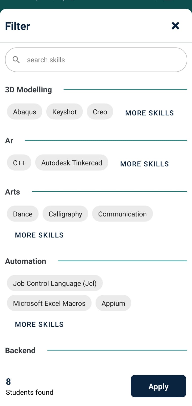 Searching and selection of a skill in filter section is easy but DeSelection is not. We should display selected skills on top below search bar. We can also add a reset button to this page if user wants to search for a person will different skill set <img src="https://user-images.githubusercontent.com/54139853/140452616-feb2c78d-eb20-4bff-be1d-5469d850214f.jpeg" width=200 height=400>