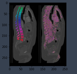 I have my ground truth image with overlaid segmentation. The image is in grayscale and the segmentation is in colour, the two have been blended together and a 2d slice is correctly displayed with plt.imshow