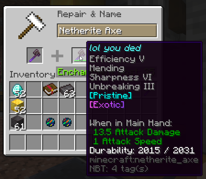 The result item should have sharpness 6 on it, not 5. Item 1 <img src=https://i.imgur.com/rwHchtf.png> Item 2 <img src=https://i.imgur.com/SC3vnpH.png> Result <img src=https://i.imgur.com/Ls5JMlk.png>