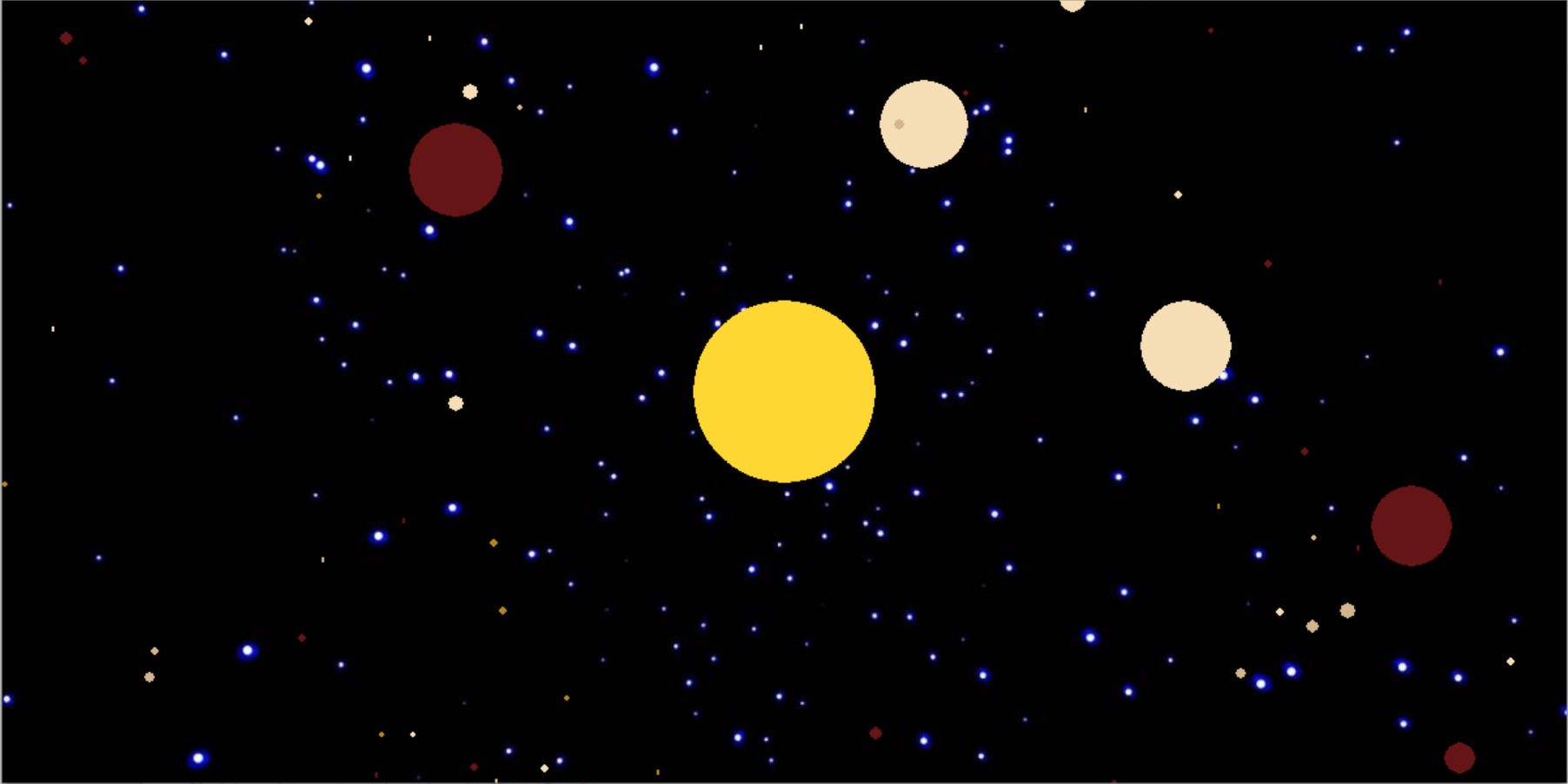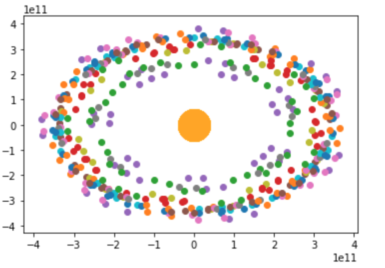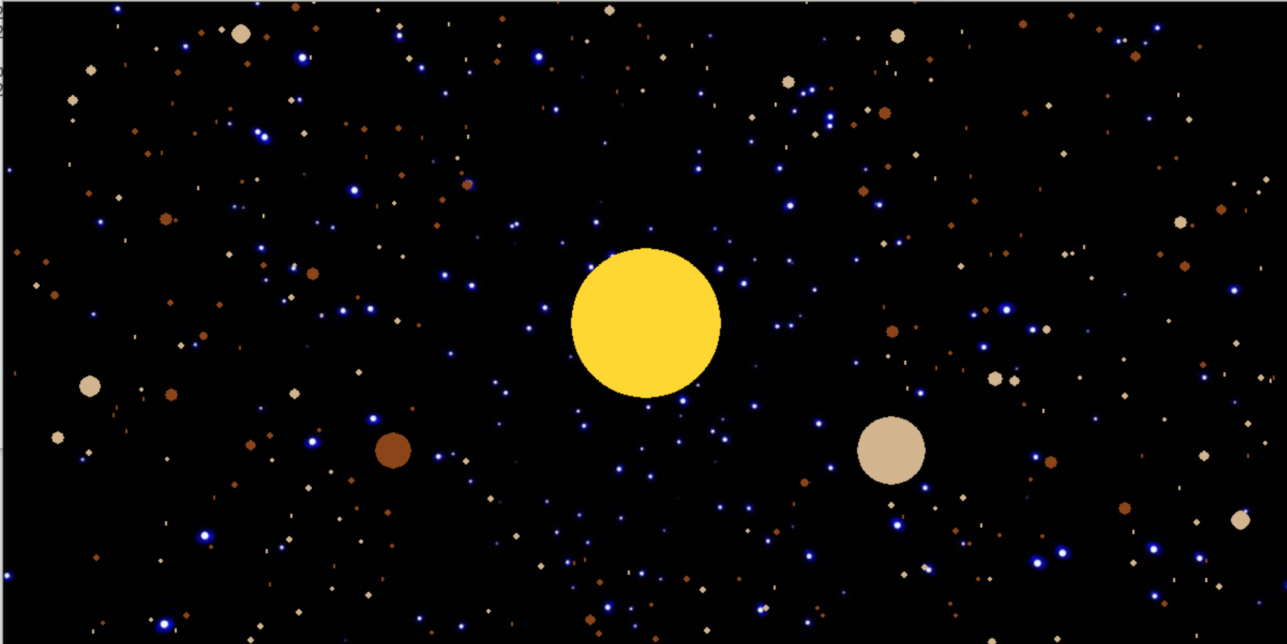 We then began coding our star. We wanted the density, the diameter and the star's mass to be variables that we can change. Later on we also put a mass for the planetesimals that can also be changed. Once we had all the components, we started coding the collisions between the planetesimals and therefore, also their mouvement thanks to Pygame, which is a program that unables the possibility to create animations. We had several issues with that part. At first, the program would stop after one collision, then it would go on after the first collision but it wouldn't make any more. After finally solving the problems, we now have a forming planetary system. We can clearly see the collisions between the planetesimals that grow everytime. Here you can see a screenshot of our final model of a planetary system: