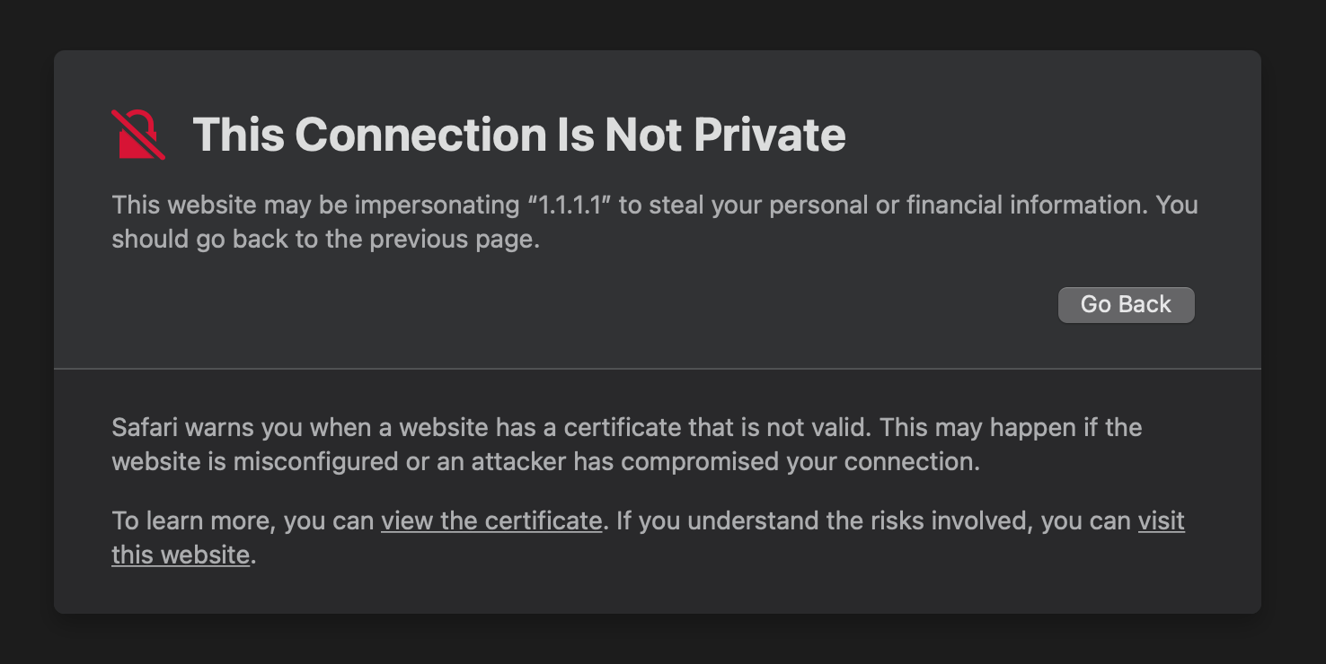 If we enable SSL Proxying on IP Address, such as https://1.1.1.1:443, we will get SSL Error and the big warning from Safari/Google Chrome.