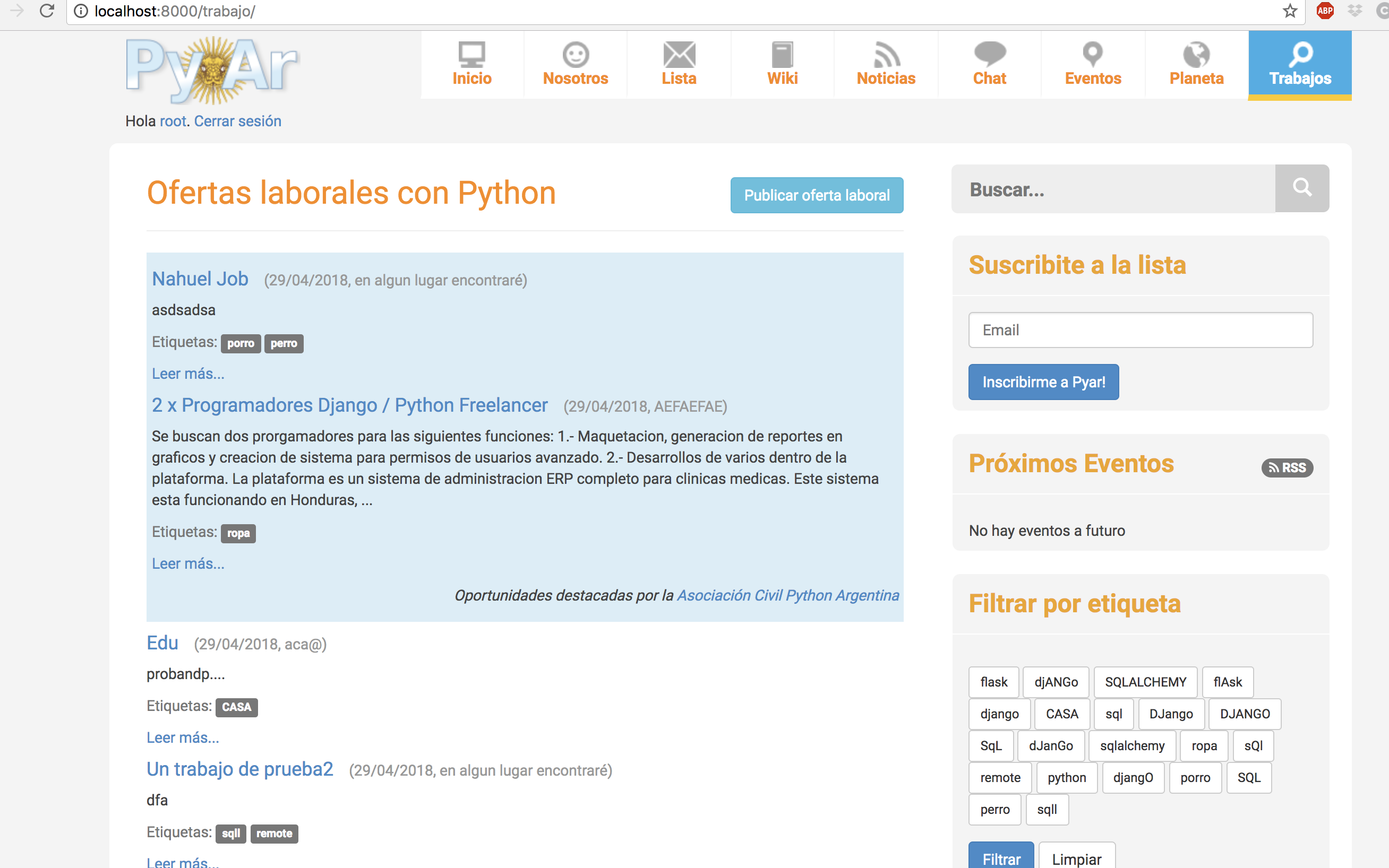 * add flake8 to tests. * pep8 police * move flake8 config to .flake8 * fix pep8 args * add python3.5 and 3.6 to travis-ci * speed up tests * Add a general word-wrap style rule * Use docker image from dockerhub. Makefile with command alias * Adds gender field to EventRegistration model * Adds migration related to new gender field * Adds gender field to corresponding forms * Show the gender in registered list and CSV. * fix pep8 * Change the homepage context * Replaces Ultimas Noticias and Últmos Trabajos with a new section * Refactor the homepage as a class-based view * Added factories for testing * Added tests for the new homepage * Sanitize html inputs on Events and Jobs (#412) * fix autosuggest js on jobs form * refs #409 #410 add html_sanitizer to description field of Job and Event * refs #409 410 add tests to Job and Event views * remove duplicate requeriment * adjust code to pycodestyle * fix wrong exception class * Update job_form.html * added normalize_tags function on job utils (#418) * 407 migration to fix tags (#419) * Arreglo error de linter * Added new makemigrations shortcut * added missing migration * Adds a migration to clean the tags * split function to use ir * Use tag normalization function in migration * #346 autoslug (#420) * added autoslug fields to events * fixed url position * Fixed migrations (#423) * Resolviendo issue #383 (#425) * Resolviendo issue #383 Agregue el EMAIL_CONFIRMATION_LA_DOMAIN con el valor "python.org.ar". Probado en un servidor debug funciona correctamente el link. * arreglando error de flake8 * 417 sponsored jobs (#424) * Added rank for pycompanies, updated joblist view with sponsored jobs, added ac.civil badget to pycompanies * Changes after code review * moved css styles and other html stuff * Fixed typo and added one test with rank==0
