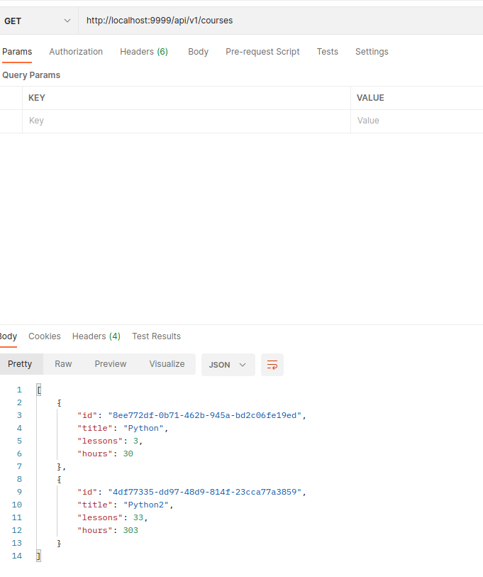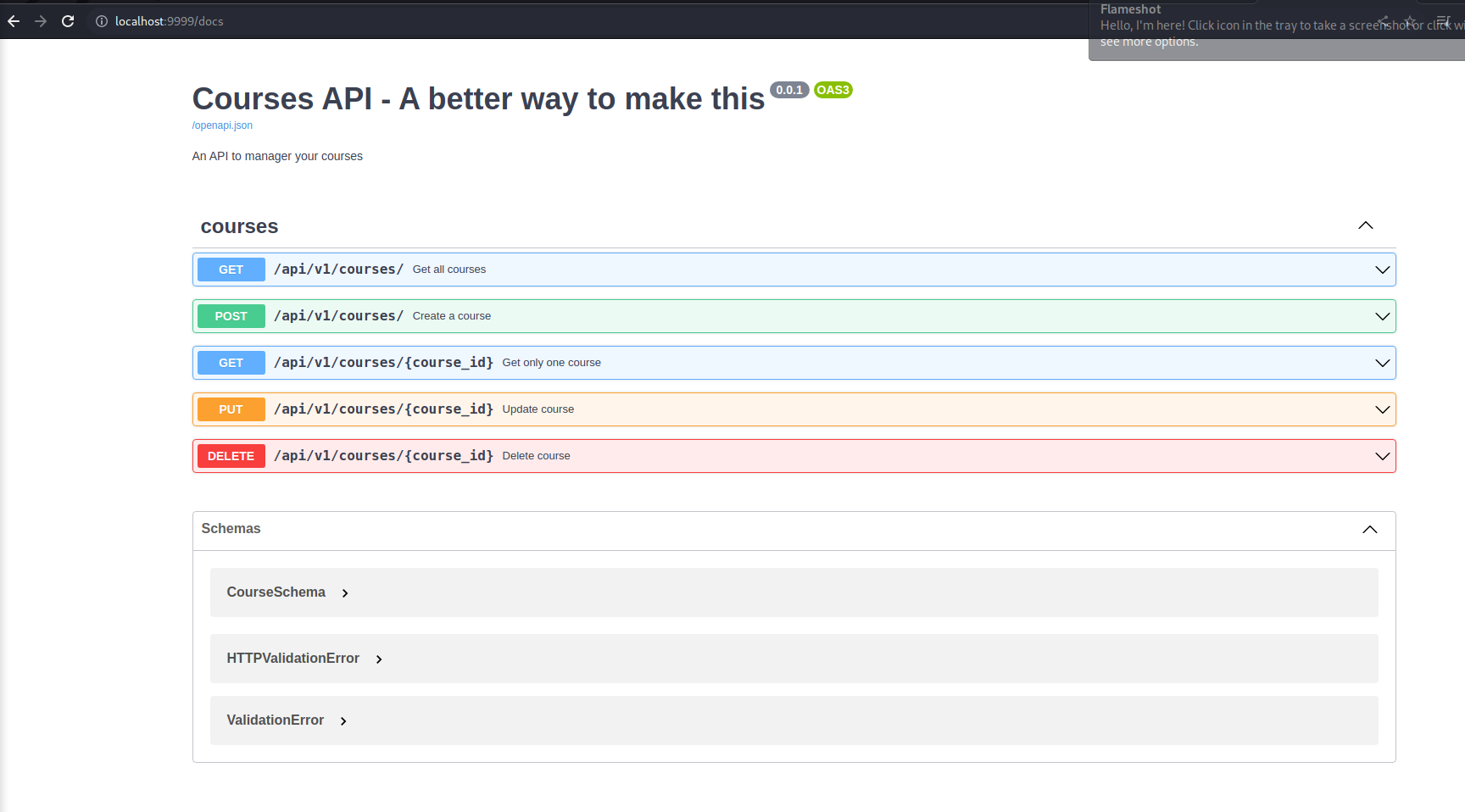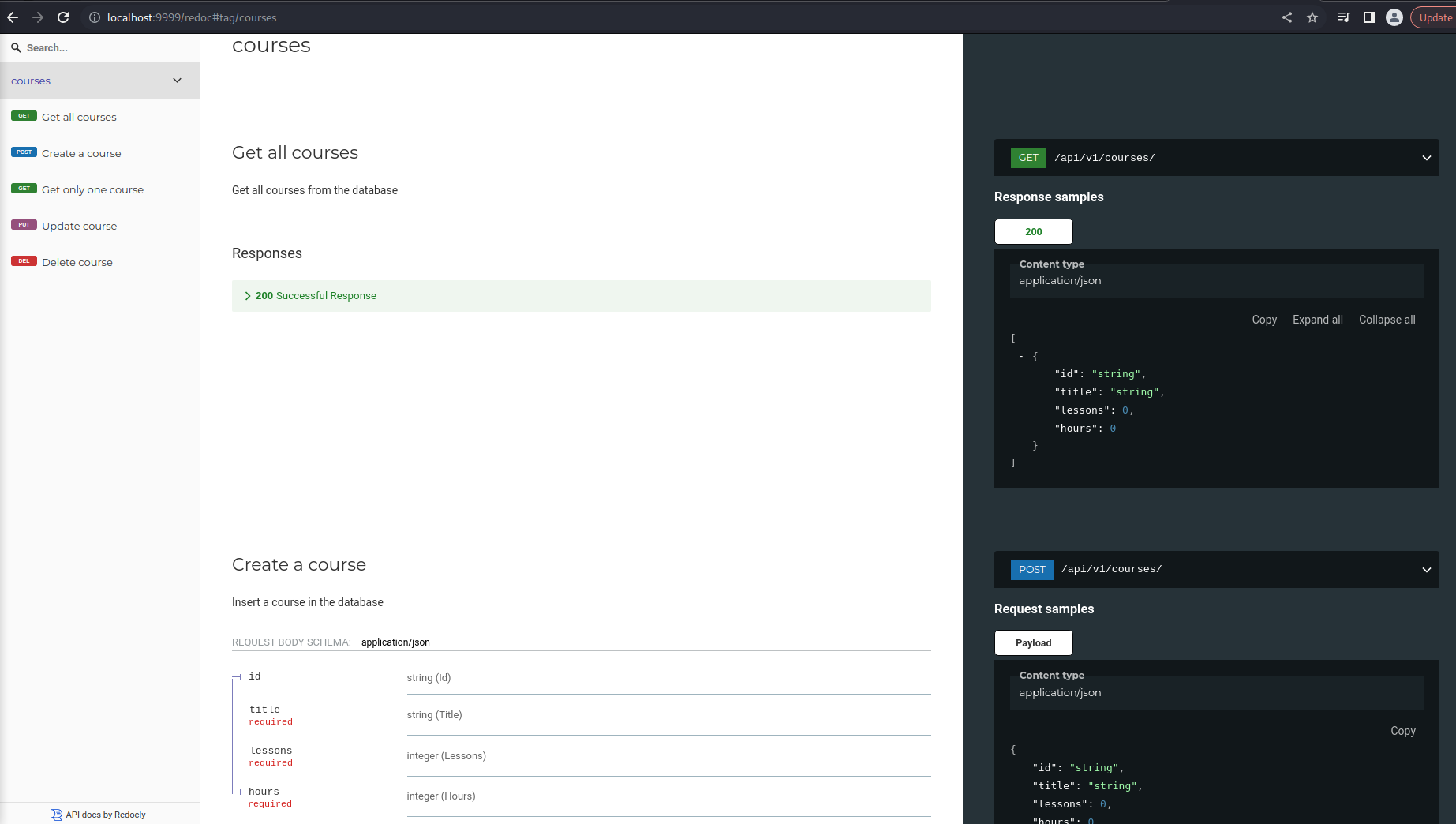 Course api An async api to manager your courses Python version: 3.11 Database: async sqlite This project uses type hint Endpoints: /docs /redoc Methods: - GET, PUT, POST, DELETE on /api/v1/courses or /api/v1/courses/<id> RUN if not exists: python /dao/create_tables.py After that: python main.py