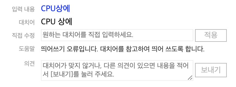 덧붙여서, CPU 상과 같이 띄어쓴 것은 아래 첨부 이미지와 같이 부산대학교 맞춤법 검사기의 도움을 받았었습니다. :)