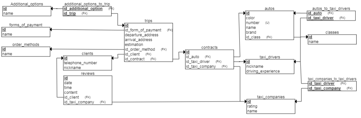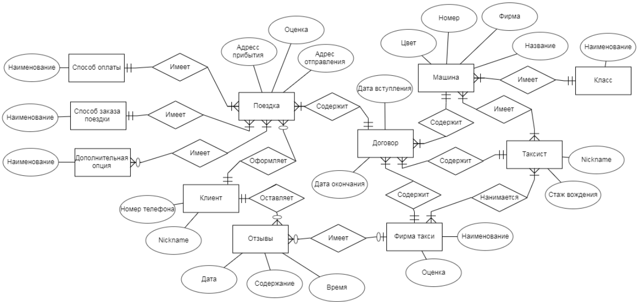 ERD-диаграмма полученная, при проектирвоании нашей БД такси-компаний и информации на них.