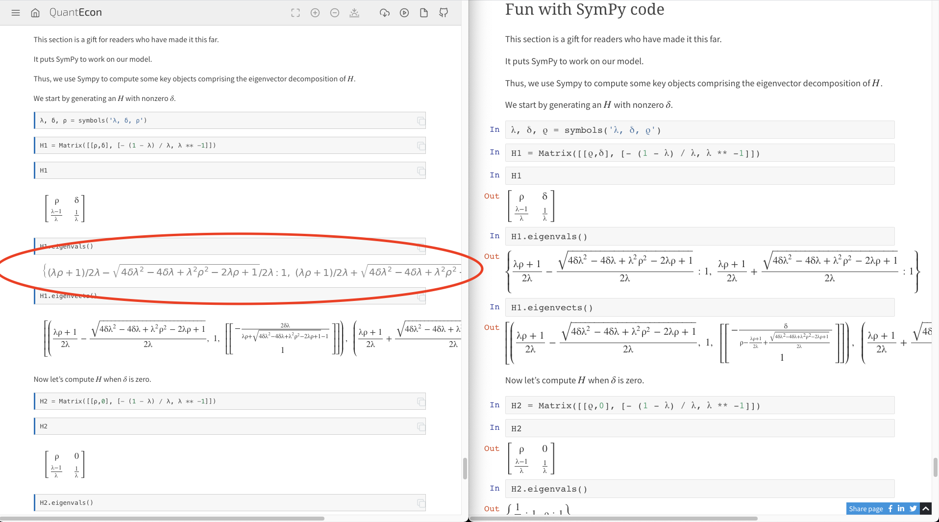 Hi @mmcky , I noticed another issue in lecture [re_with_feedback](https://quantecon.github.io/lecture-python.myst/re_with_feedback.html#fun-with-sympy-code): - the latex math expressions generated by code look very strange or wrong. For example, please see here (left: ``MYST``, right: ``RST``),  and  and