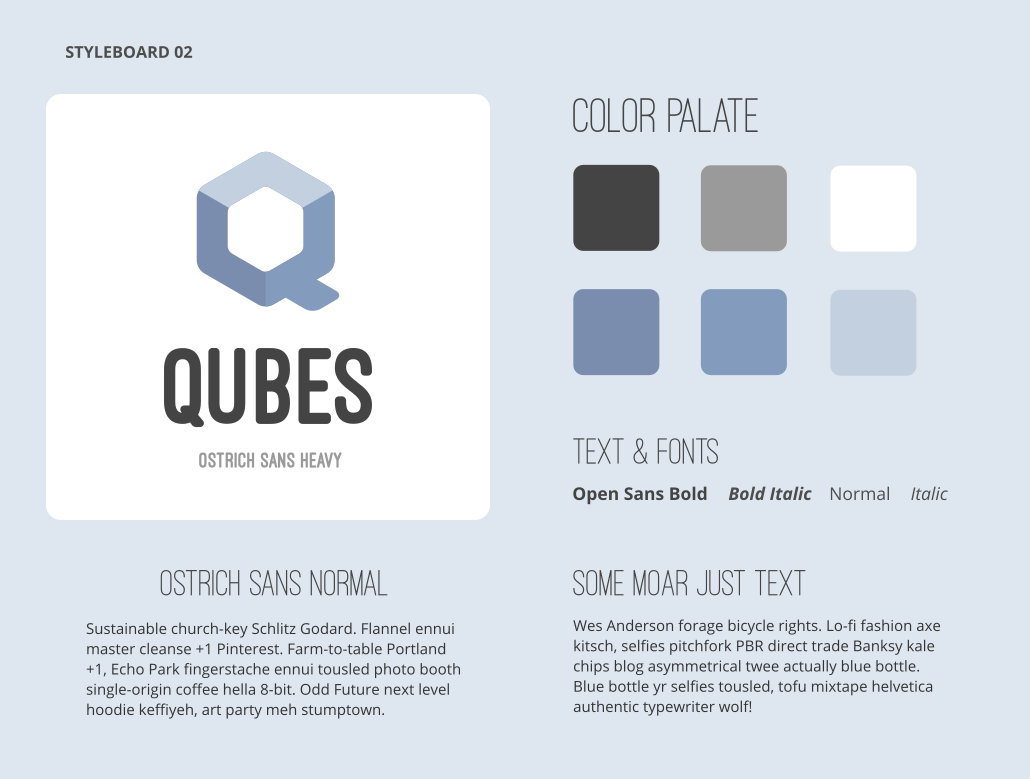 styleboards 1, 2, and 3 are all nice in different ways. 1 is most similar to current style, 2 is the most chill (probably my favorite). Both 2 and 3 have a three-tone Q while version 1 has a two-tone Q, I prefer the two-tone Q. font-wise they both seem fine, the open sans Q is very different from the logo, Ostrich may look a little more like the logo. I dunno if that's what you're going after. love the filler text :) |