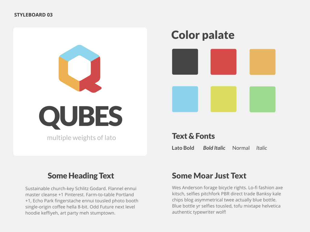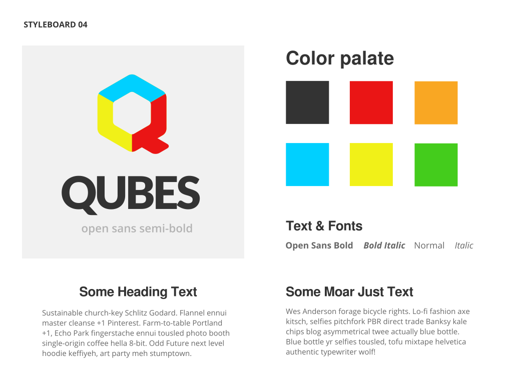 I've created a first pass at a variations of fonts, colors, and styles for the Qubes branding. To explain this part of my design process: this is a simple template to easily compare different styles in a rapid & easy way. I hope to get feedback / favorites / etc... from the rest of the team on which "styleboard" seems to be a favourite or which one needs more exploring. From there, I will apply these styles to the actual site designs & icons I have been working on. |