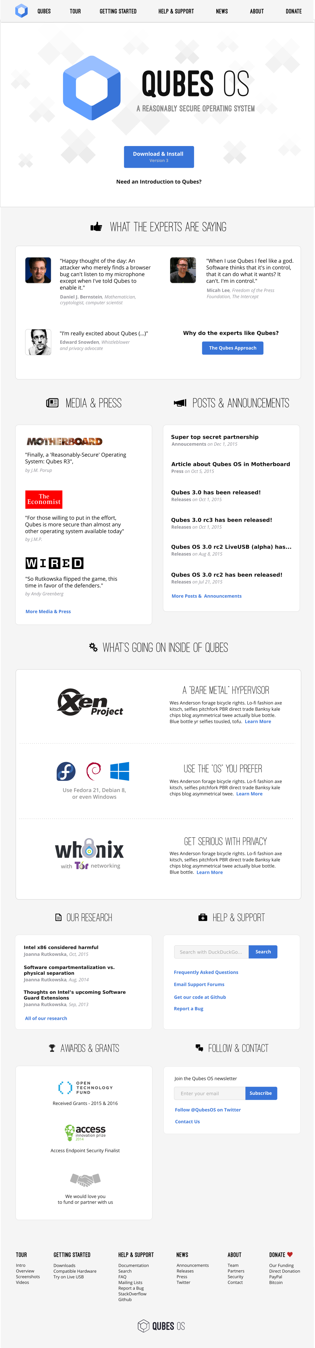 in case you still need some copy, here's a draft: Security that WorksQubes brings to your personal computer the security of the Xen Project hypervisor -- the same software relied on by major hosting providers to isolate websites and services from each other. If it breaks, so goes the global digital economy. Use the OS and Apps You LikeCan't decide which Linux distribution you prefer? Still need that one Windows program for work? With Qubes you don't need to pick a favorite or compromise. Get Serious with PrivacyWith Whonix integrated into Qubes, you can easily route network traffic through the Tor anonymity network. |