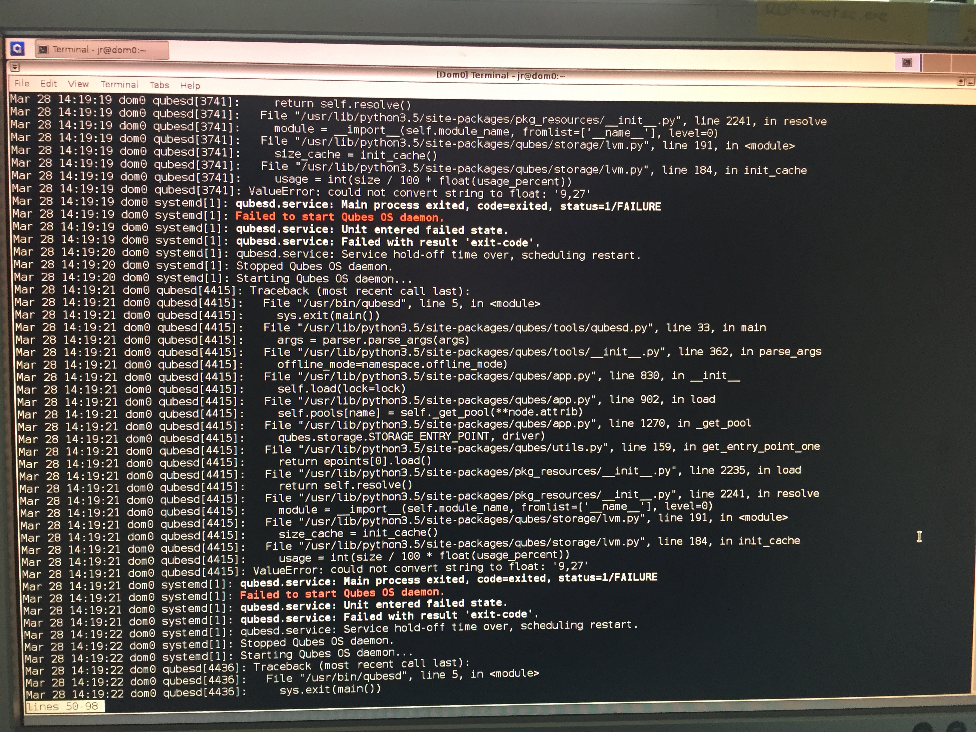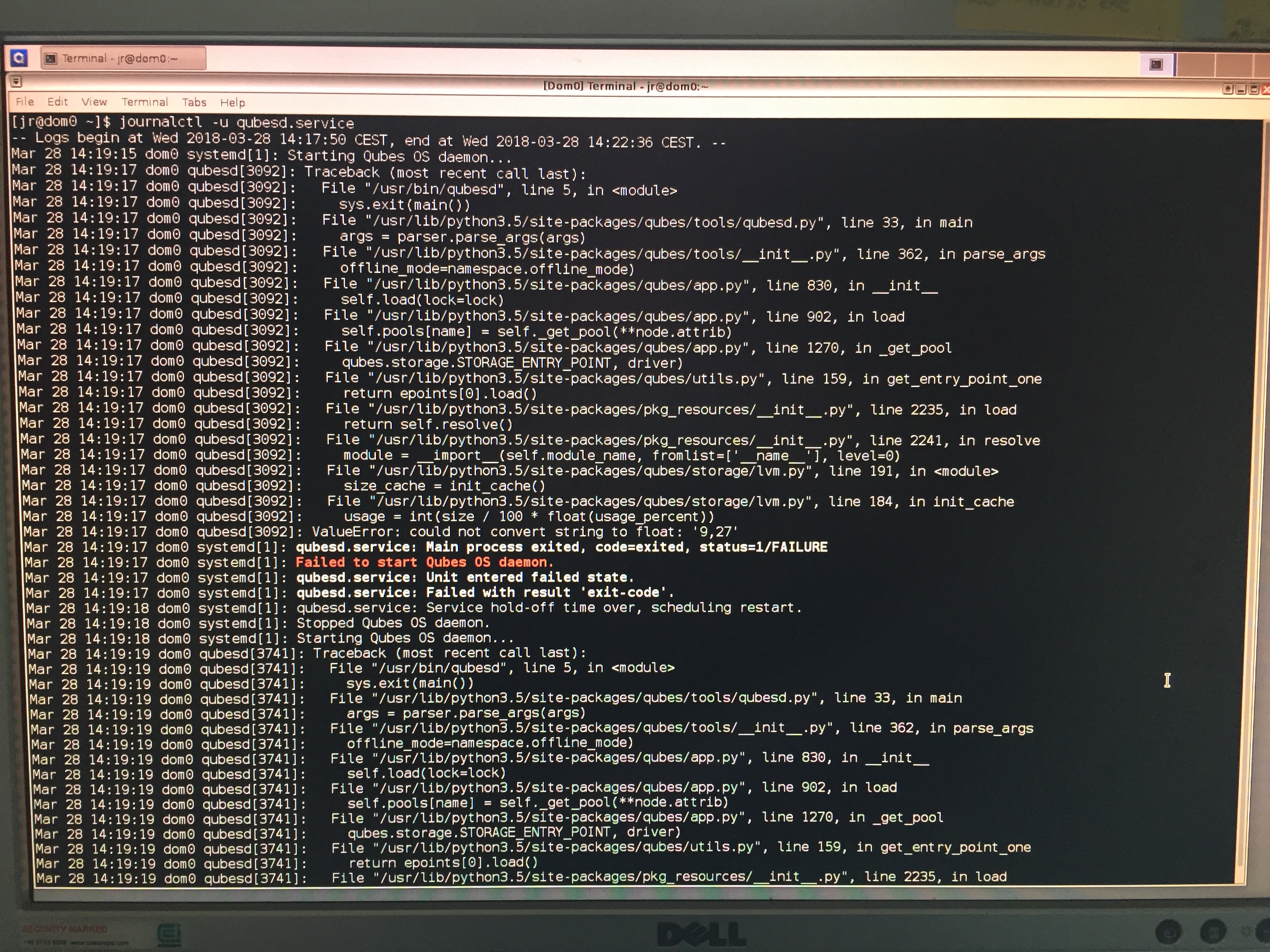 After reboot not much works. I have tried to select System Tools->Qubes Manager and ->Restore Backups, but they both fail with these messages:
