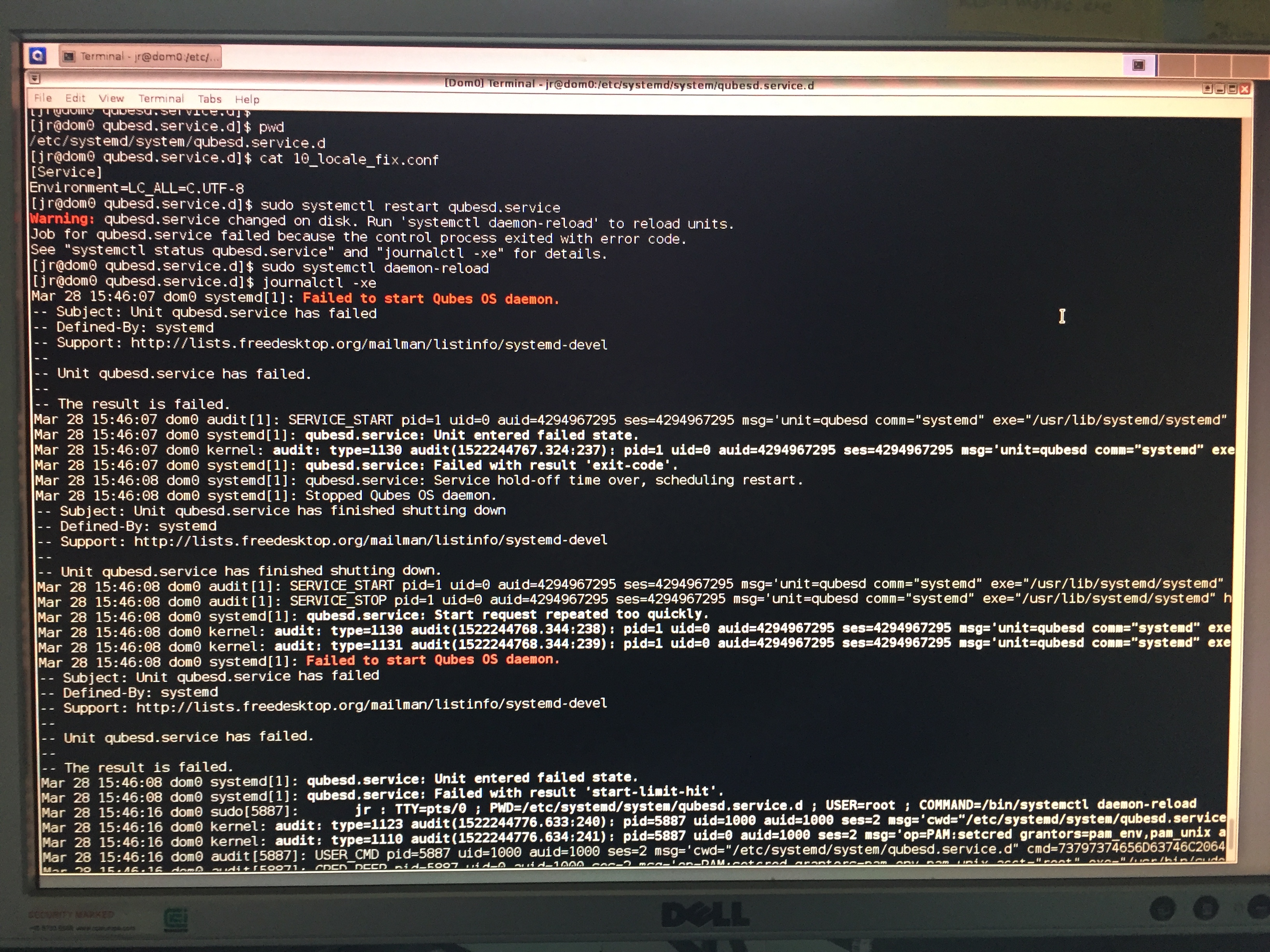 Create /etc/systemd/system/qubesd.service.d/10_locale_fix.conf with: