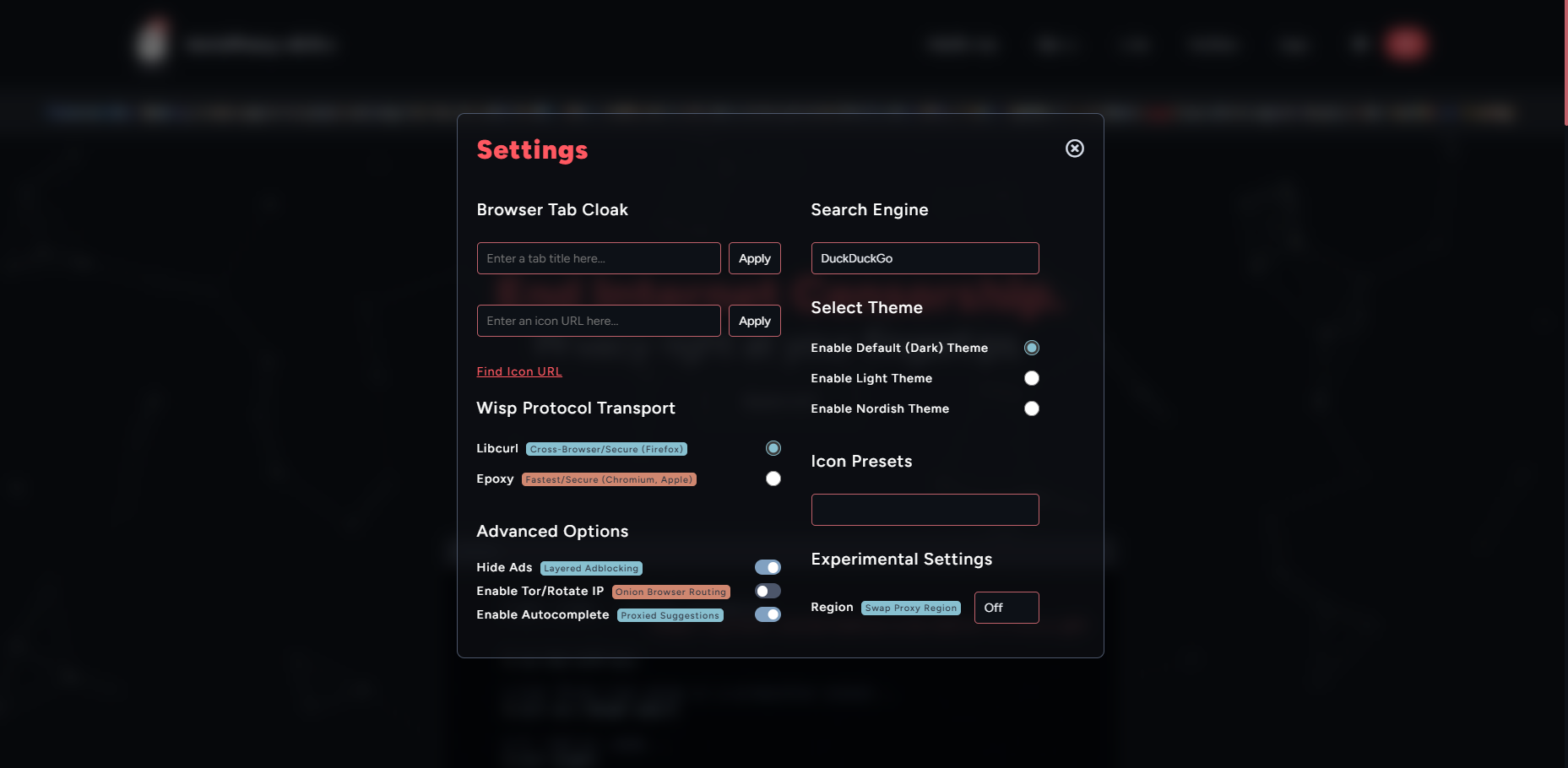 This project currently uses Scramjet and Ultraviolet as web proxies adhering to the Wisp protocol. Bare-Mux is utilized for swapping transport systems to be utilized with Wisp. The included transport systems are EpoxyTransport and libcurl-transport. Rammerhead is also provided as an additional web proxy option.