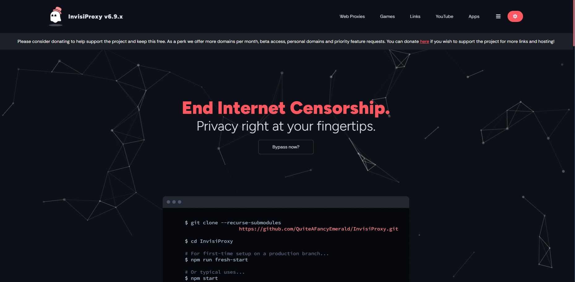 This project serves mostly as a proof of concept for the ideal clientless solution to bypassing censorship. A good use case of this project would be if you ever needed a clientless solution to use Tor or leave minimal traces of device activity. Simply host this project on any domain and have an alternative solution to a VPN without needing to download anything on said device. Being a secure web proxy service, it supports numerous sites while being updated frequently and concentrating on being easy to self-host. InvisiProxy LTS works with a large number of sites, including YouTube, Discord, GeForce NOW and more! Also has a good amount of locally hosted games featured on the site.