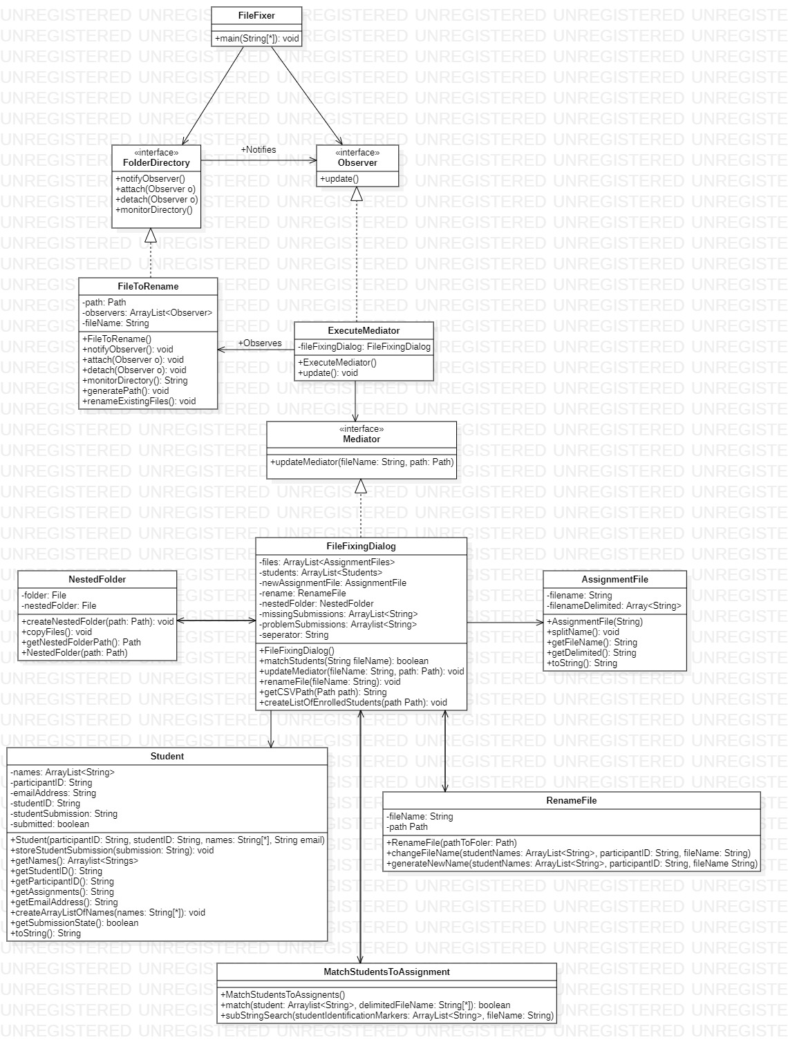 For the program, the Observer design pattern is used to monitor a folder called FilesToRename where the user inputs the student list .CSV file and the assignment files. When those files are inserted into the folder and the user runs the program, the Instigator observes the FilesToRename folder. The ExecuteMediator realises there are files in the folder and notifies the other objects that depend on the FilesToRename object where the folder is observed. Once the objects are notified, they do what they are supposed to do in order to rename the files.