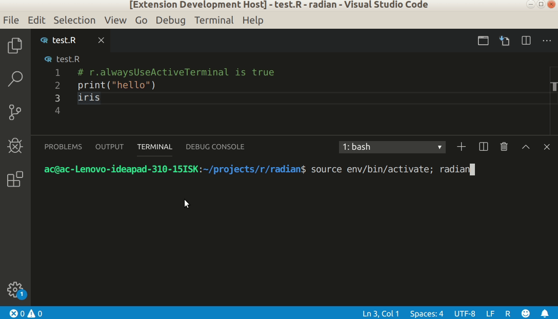 R: Run Selection/Line in Active Terminalworks for terminals other than the R Interactive terminal. This PR adds a settingr.alwaysUseActiveTerminal(falseby default). When this setting is enabled, all commands (R: Run Source,R: Preview Dataframe,R: Knit Rmdetc.) are sent to the active terminal. This allows SSH users etc. to access the full functionality of this extension.Screenshot