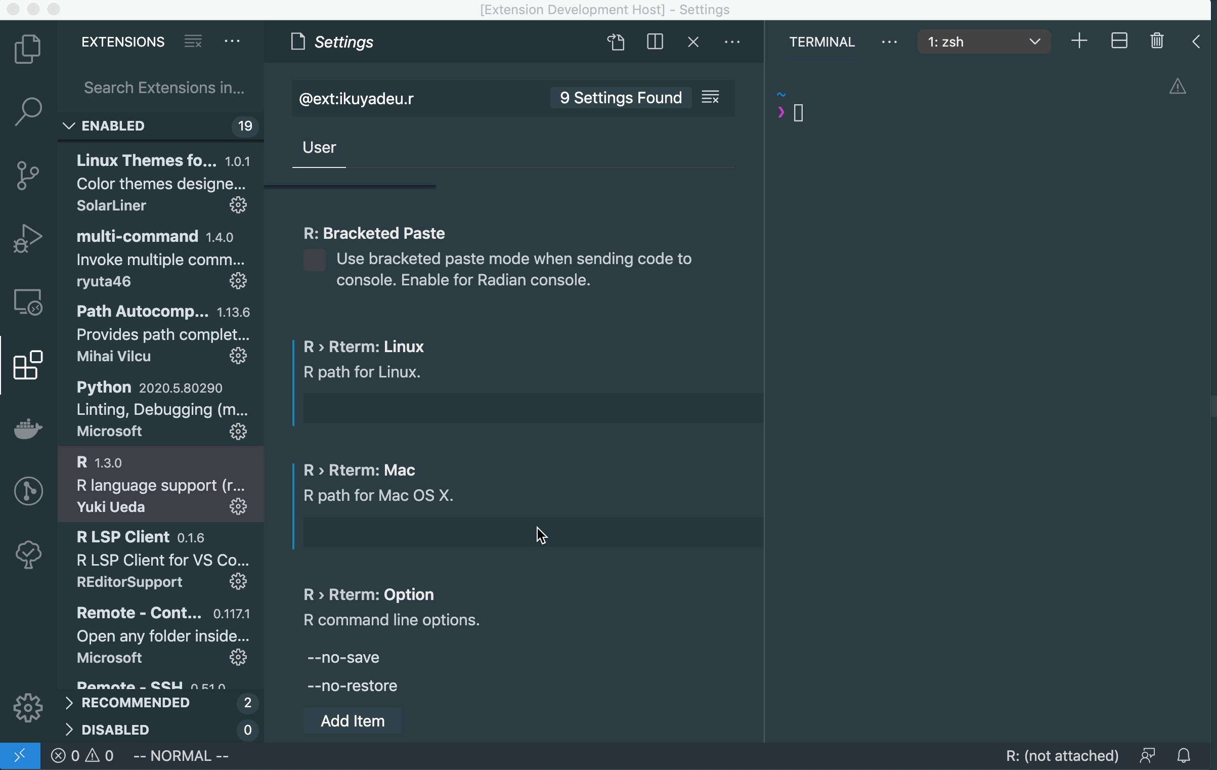 • open vscode with default settings and run "create new R terminal"