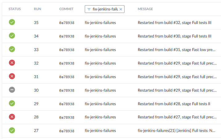 I would like to know the stats for the baseline. This would allow us to evaluate if a PR is more or less stable than develop, and, thus, decide, is it good to merge or it needs more testing/fixing. For example, is it Ok to merge a PR that has been tested once (and, of course, successfully), but with two restarts? or do we need to run the tests again? (I am assuming that our CI testing is affected by some random factor.) |