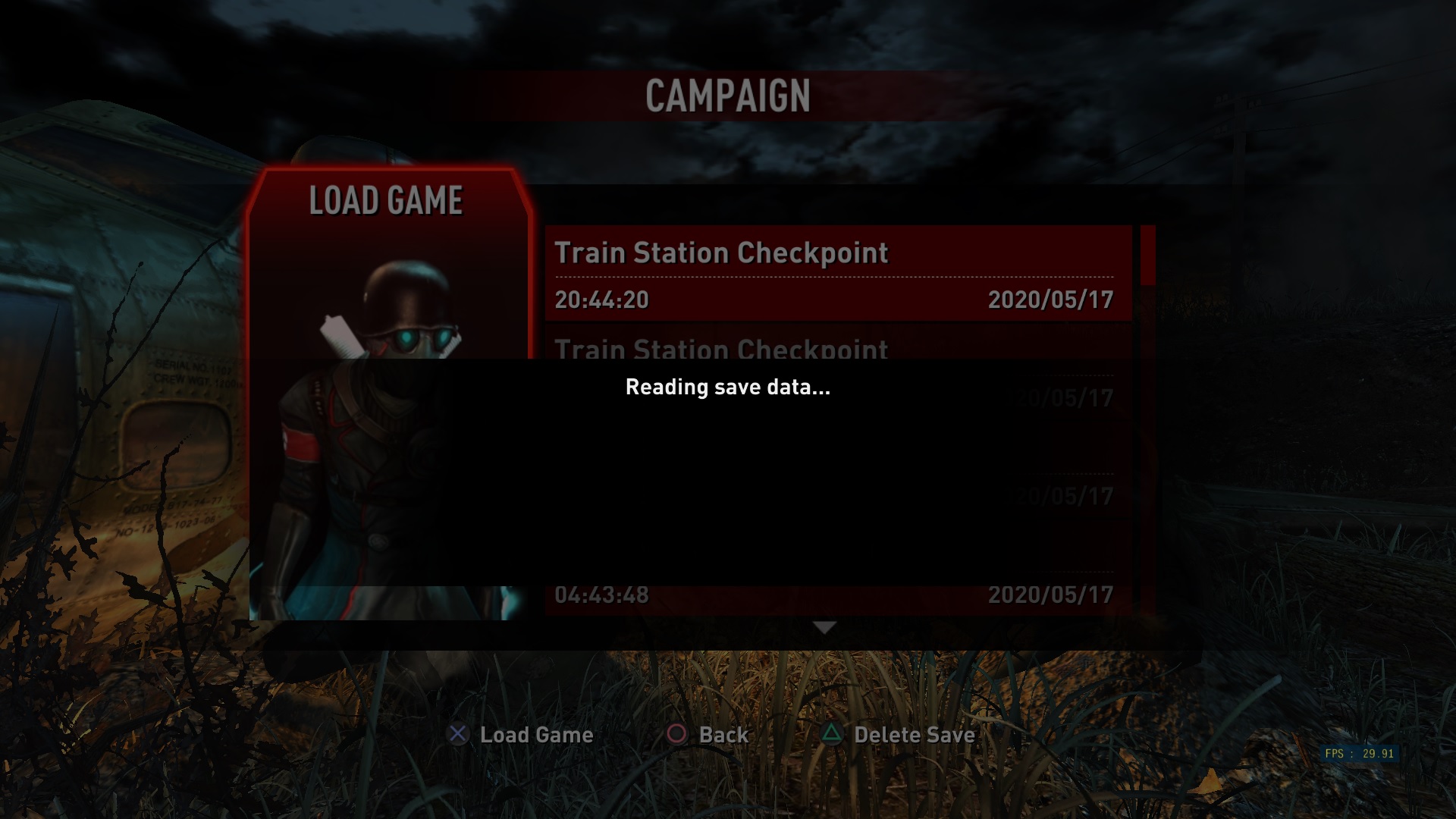 In Wolfenstein [BLUS30298] you can not load save files, the game simply gets stuck (see screen shot). The automatic creation of save files at checkpoints seems to work fine, since the files are present on the hard disc.