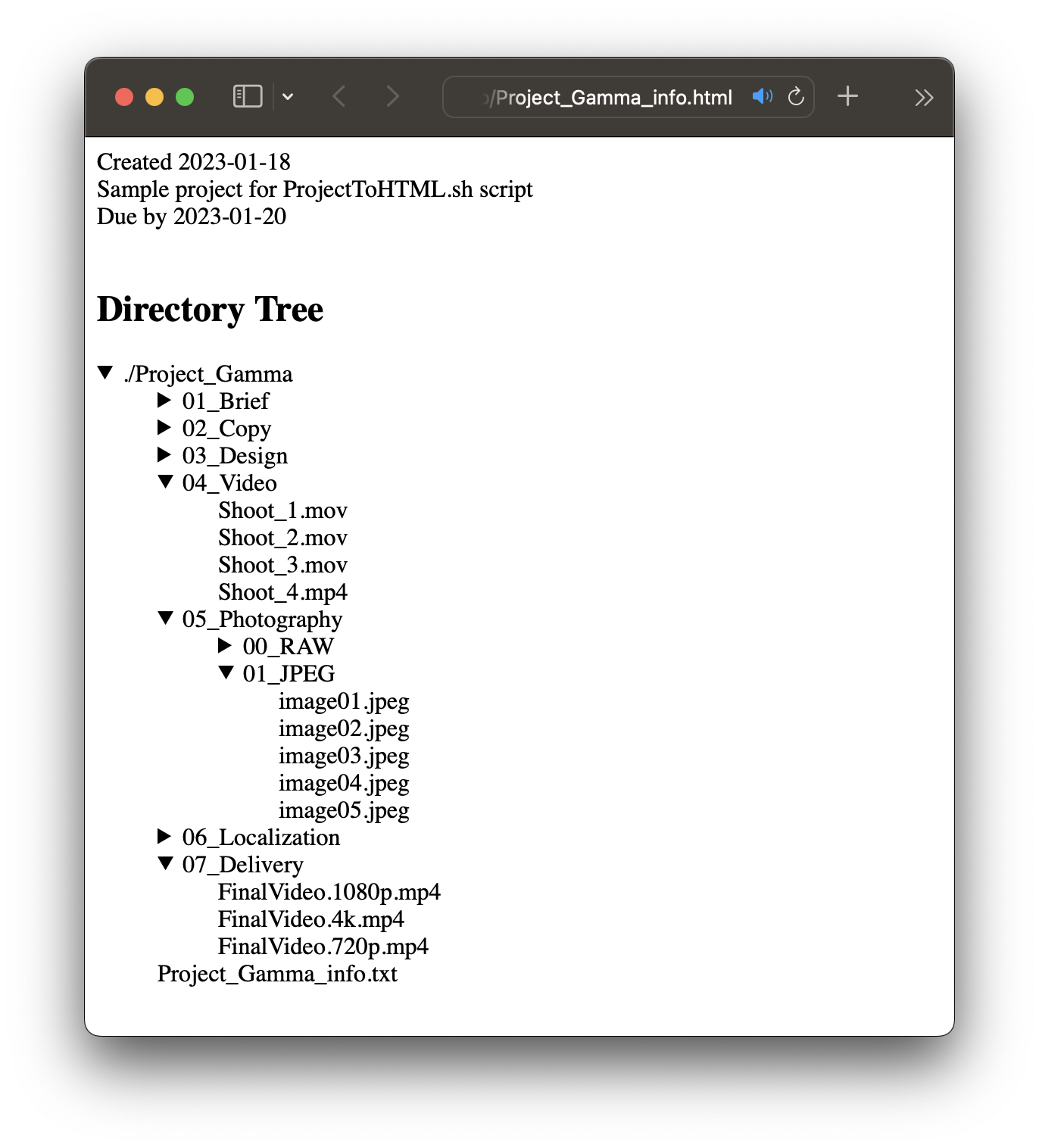 Create an html file of a list of files in a project folder