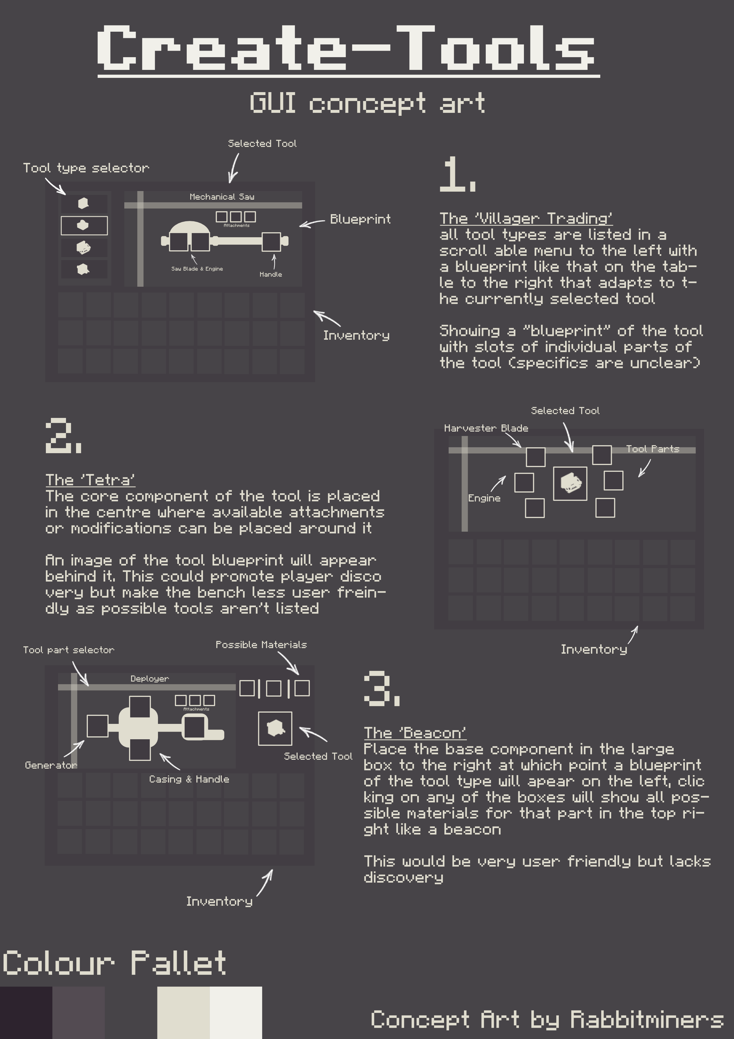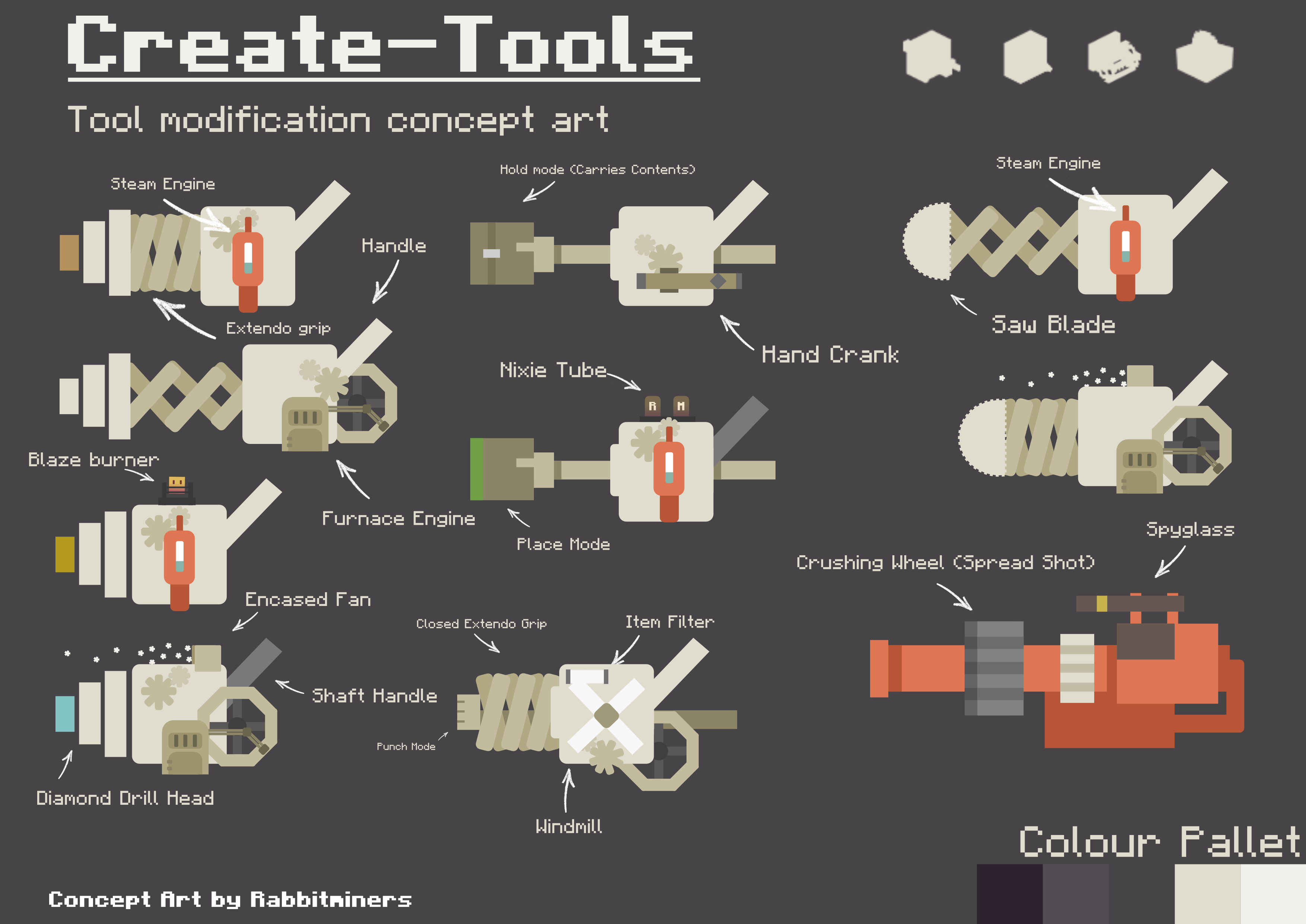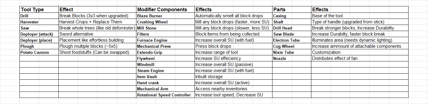 Concept: Modular tools system similar to that of tetra or tinkers construct, where you can combine create componenets to form more complex hand held tools. The number of components/tool can be limited by the SU capacity (Produced by an attached part such as hand crank or furnace engine) and kinetic force delivery (Number of cogs/belts). These will probably be assembled at some kind of workbench where the type of tool (Drill, harvester, etc) can be selected then modifer components (blaze burner, flywheel, etc) attached aswell as the parts of the tool. To stage out the usefulness of the tools drill heads etc could be upgradeable aswell as the casing the tool starts as, perhaps from wood -> andesite alloy -> brass -> chromatic/radiant/shadow, each of the last three acting as equal but with unique effects similar to providing alternatives to netherite, below is a table detailing what different components could do (early ideas, highly subject to change)