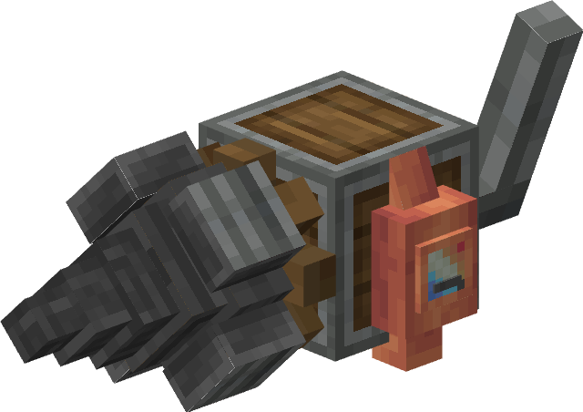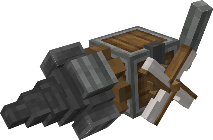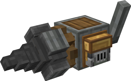 The millsonte automatically mills picked up blocks (applies before the blaze burner if it is active) to allow for quick resource processing at the cost of higher resource consomption than doing it using a millstone block. Aswell as this when combined with a potato cannon all shots will be shredded and turned into buckshot reducing there range and damage/projectile but vastly increasing the AOE of the shot. This can be stacked with the blaze burner for greater effect.