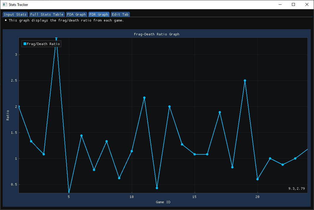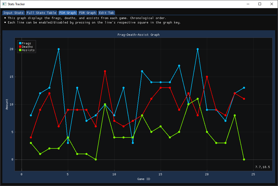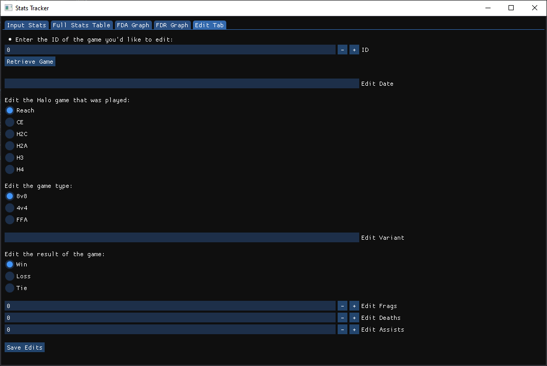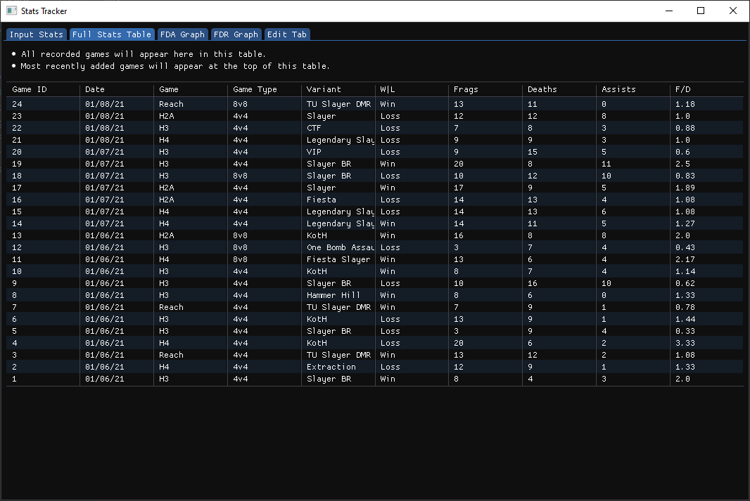 Help keep track of your Halo game stats using this Python GUI. This GUI will also graph your Frags/Deaths/Assists from each game that was recorded as well with graph each game's Frag/Death ratio.