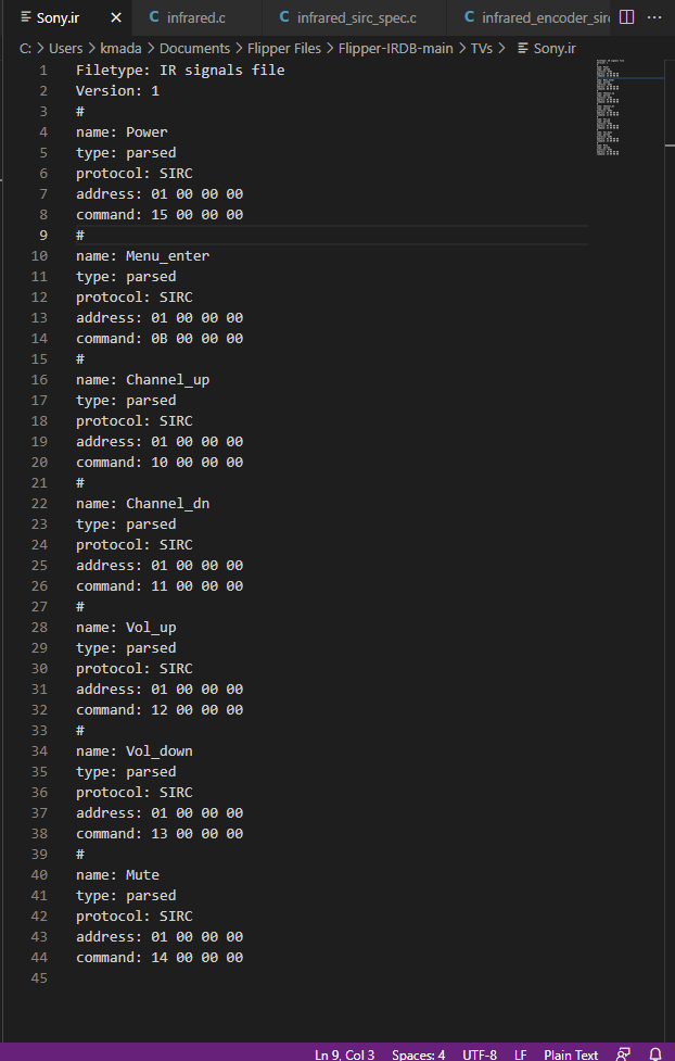 - Choose the appropriate "protocol" (shown in Sony.ir line 6) for the file in the repository (shown in 1,-1.csv line 2 under protocol).