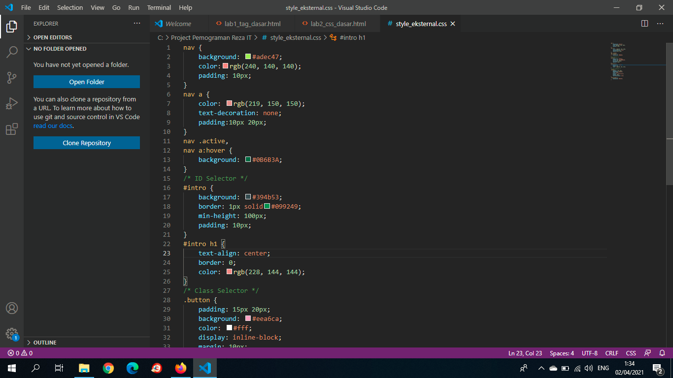 Saya merubah warna dan posisi pada tulisan hello word dan juga saya merubah jenis teks pada font family pada body. 2.Elemen h1 mencakup intro h1, Elemen h1 meliputi juga button navigasi dan #intro h1 yang bertulis HELLO WORD