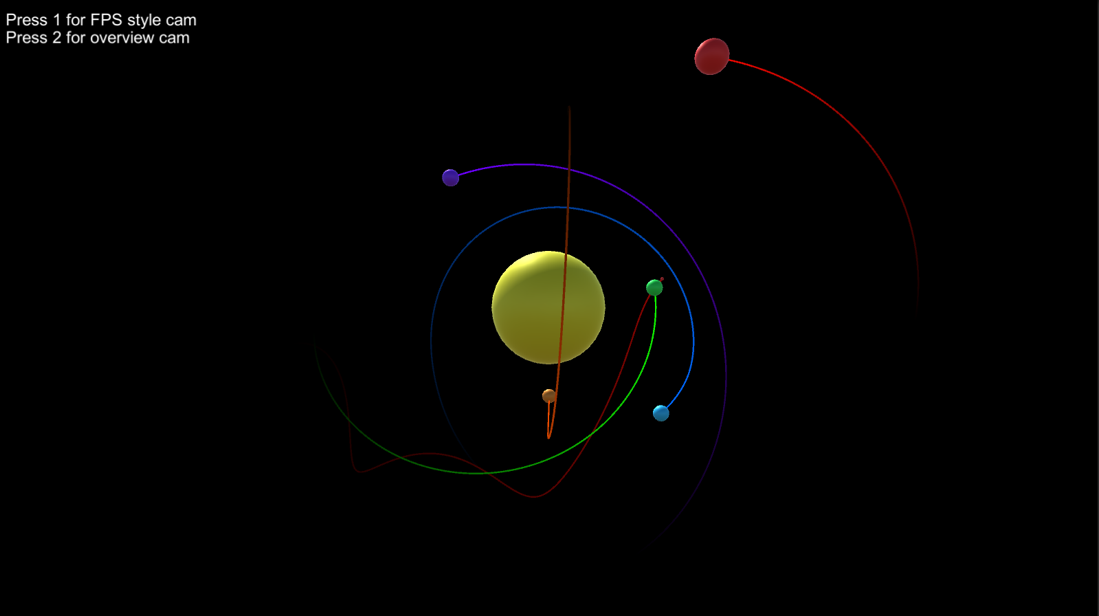 Gravity simulated using Newtons' law of Universal Gravitation.