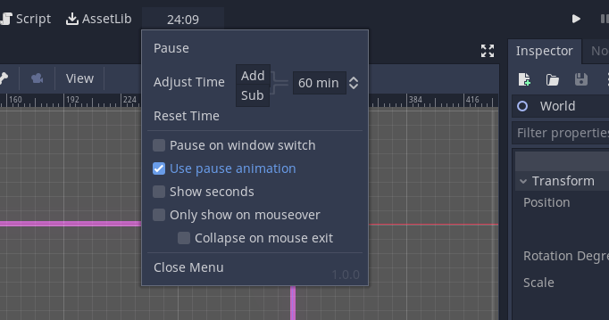 By default the timer will automatically pause if you switch to a different window, and automatically resume when you switch back. You can toggle this on and off in the menu (see below). Your elapsed time is saved when you close the editor or disable the plugin, and loaded when you open the project again or re-enable the plugin.