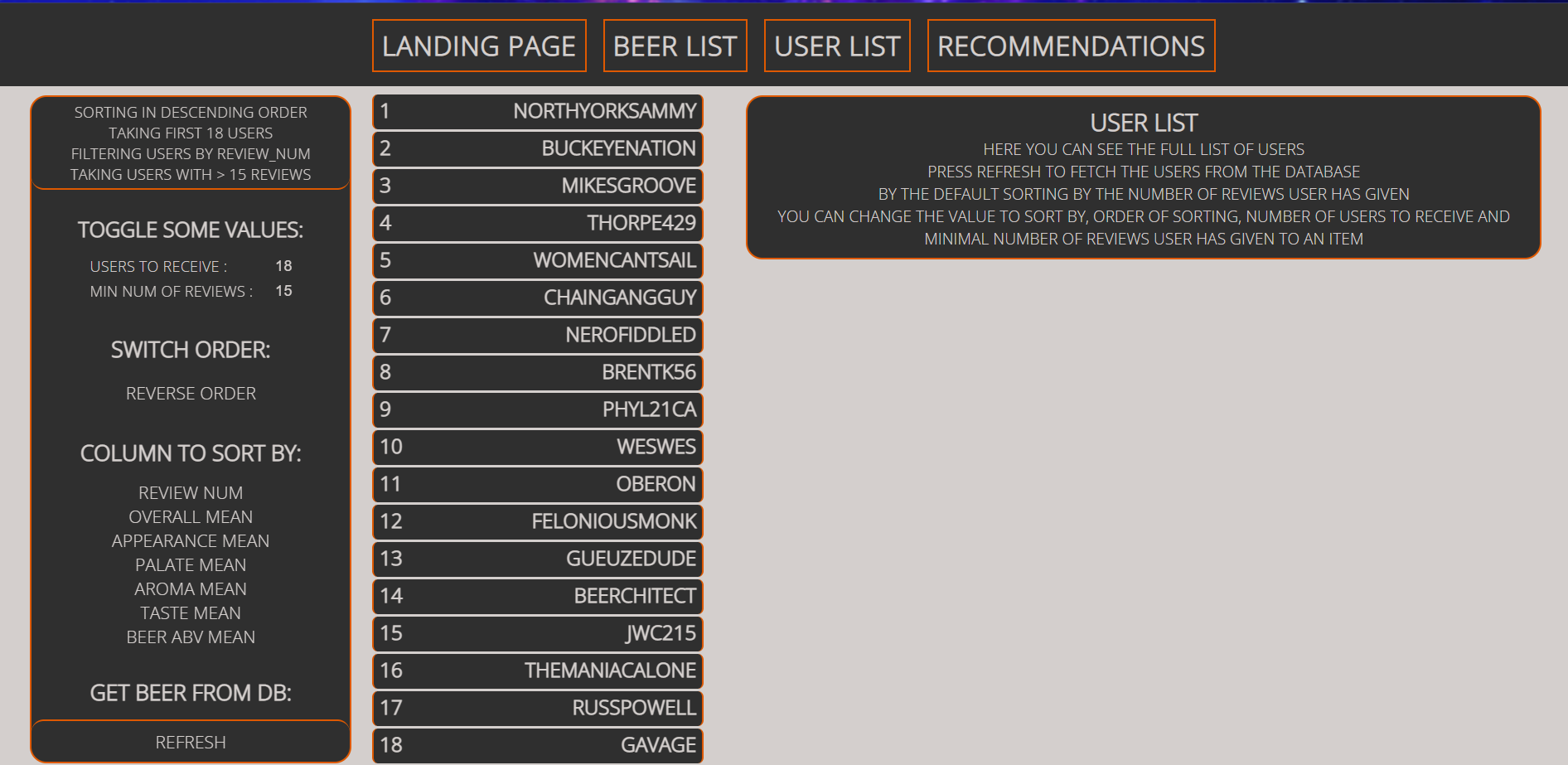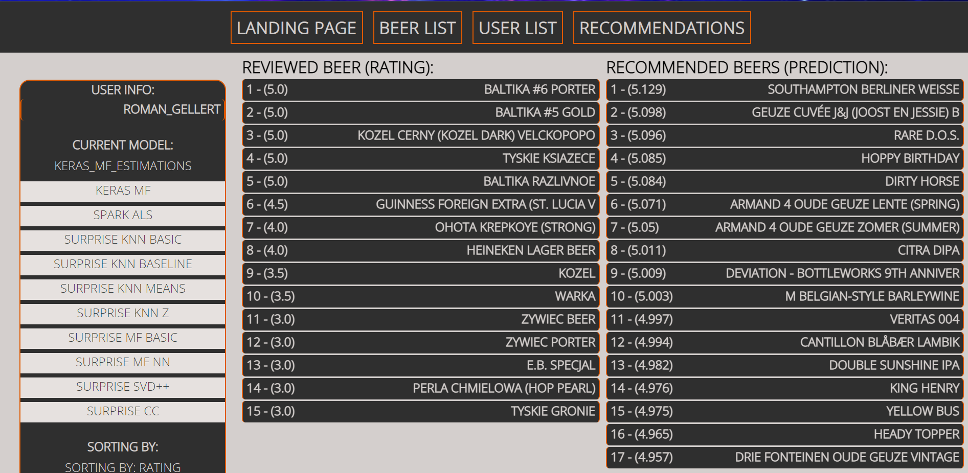 It can get info about all items and users from the initial dataset, 200 pre-trained predictions by each of 10 models for 15 users with low review count, 15 with medium review count, 15 with high review count and myself initially added to the dataset.