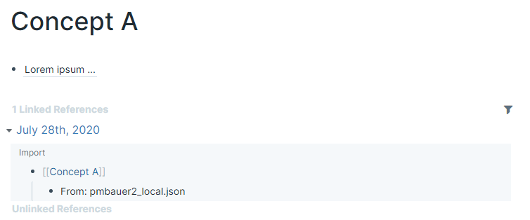 [[Concept B]][[Concept A]]but the block level back-reference on the block Lorem ipsum is missing.[[Concept A]]and edit the block containing the block reference to Lorem ipsum (e.g. add a space and delete it).[[Concept B]]. Observe the previously missing block-level back reference is present.System Information: