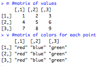 v = matrix(c("red", "blue", "green"), ncol=3, nrow=3, byrow=TRUE)